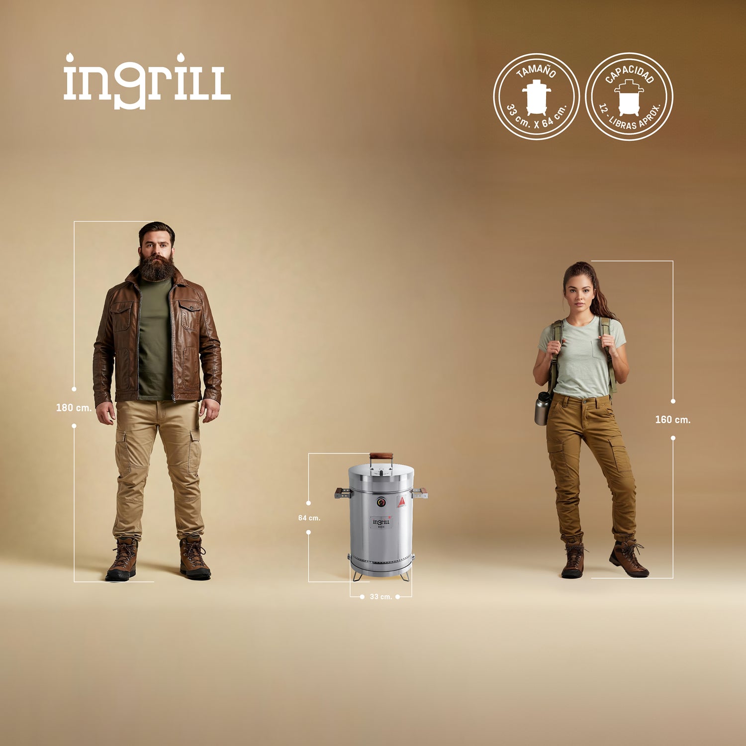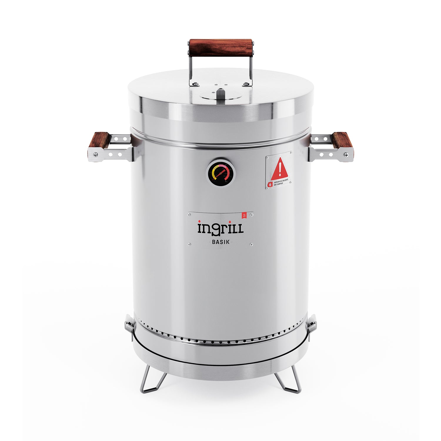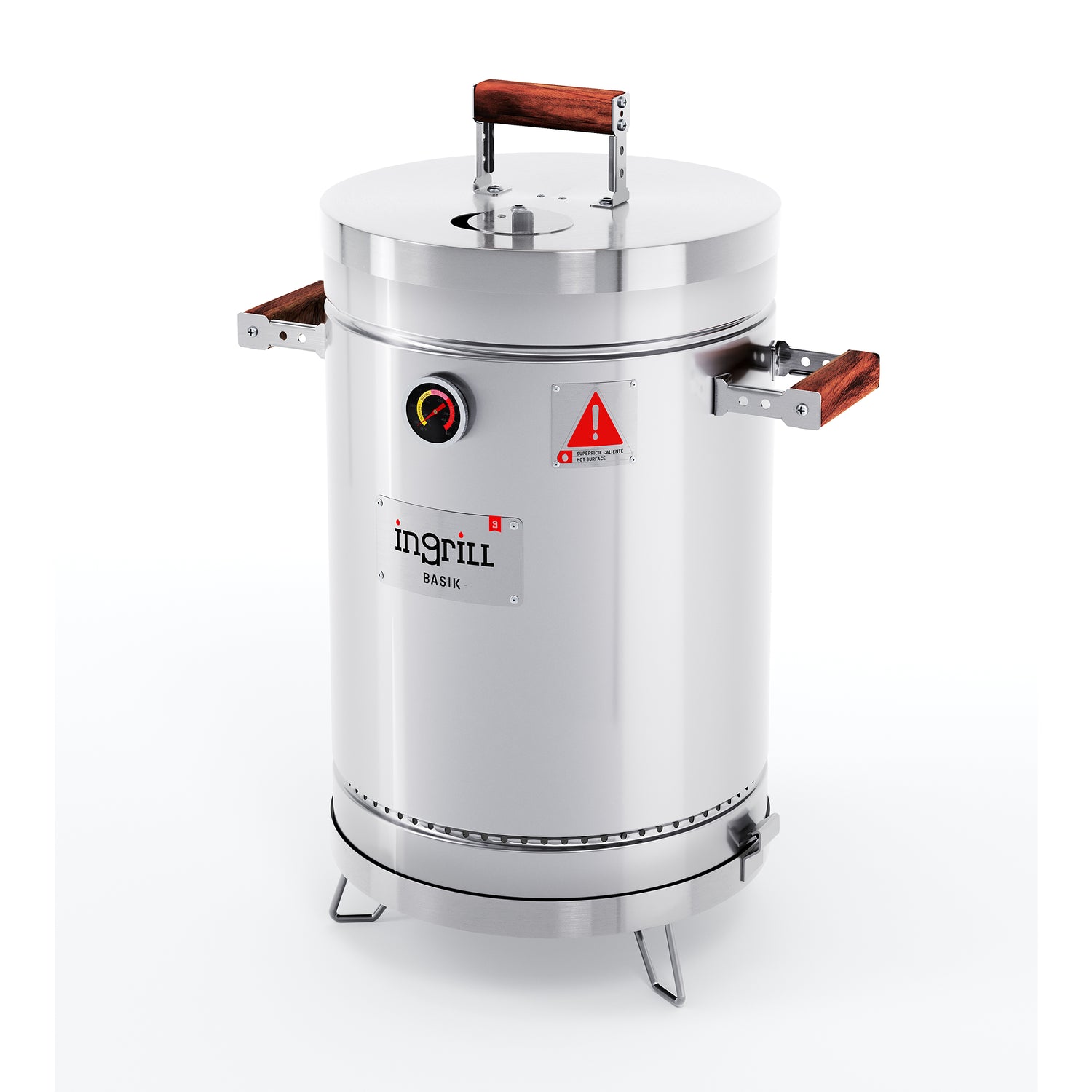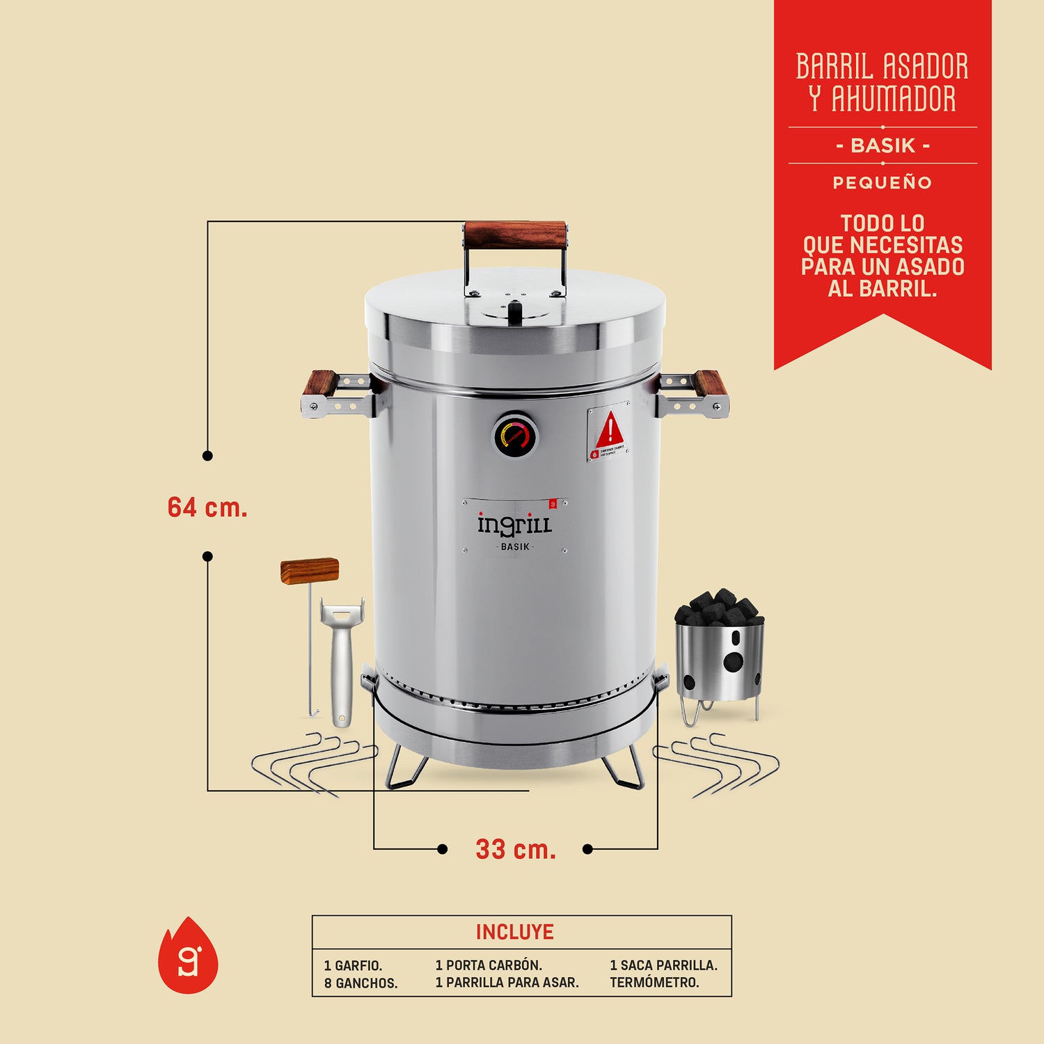 Barril Ahumador Basik Plateado 33x64cm Para 12 Libras con Termómetro y Control de Ventilación