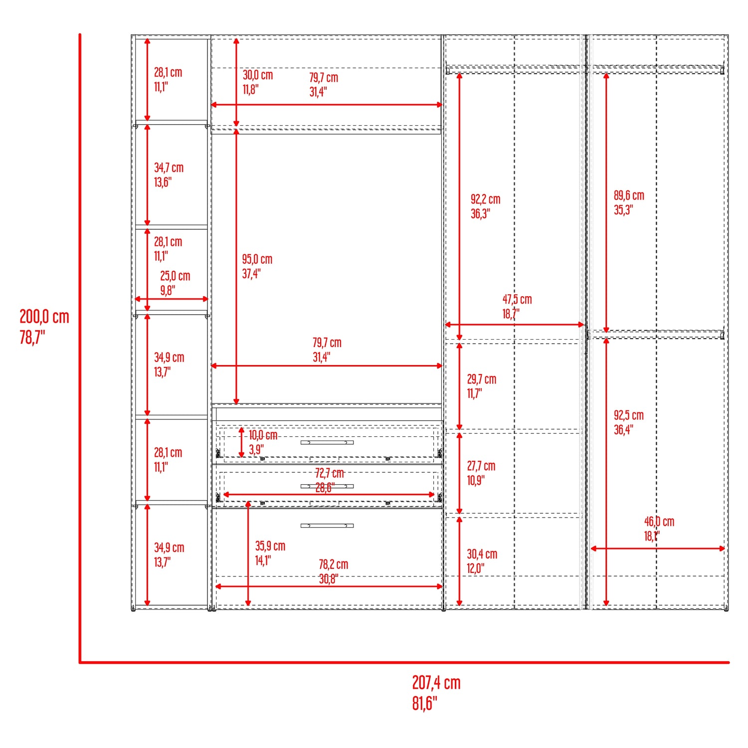 Closet Brunson Fresno y Wengue 207.4x200.2cm con Dos Cajones y Quince Compartimientos