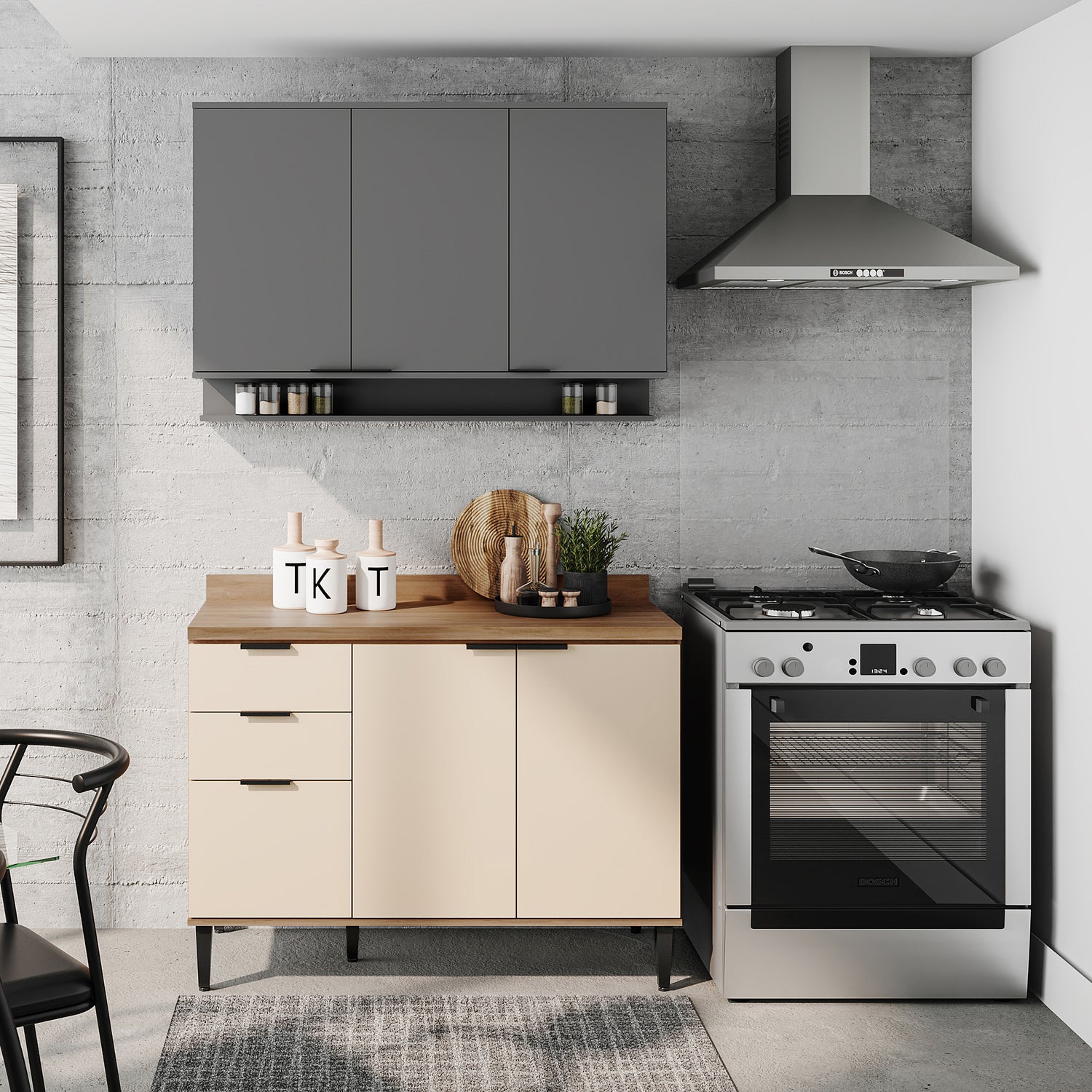 Cocina Integral Beige y Gris 120x87.5cm Con Mesón Sin Pozuelo