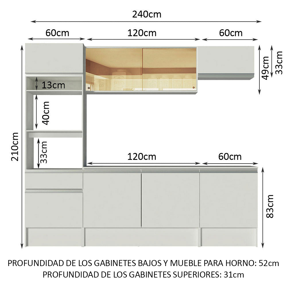 Cocina Integral Diamante Blanco 240x210cm con Mesón de Madera Aglomerada MDP y con Trece Entrepaños