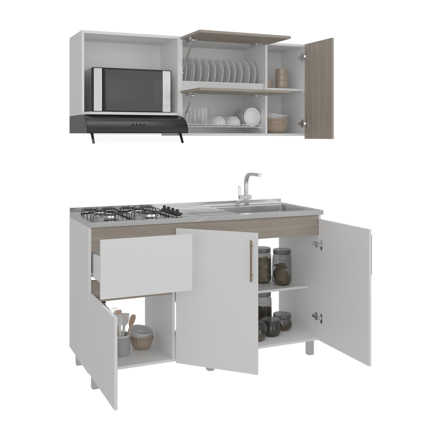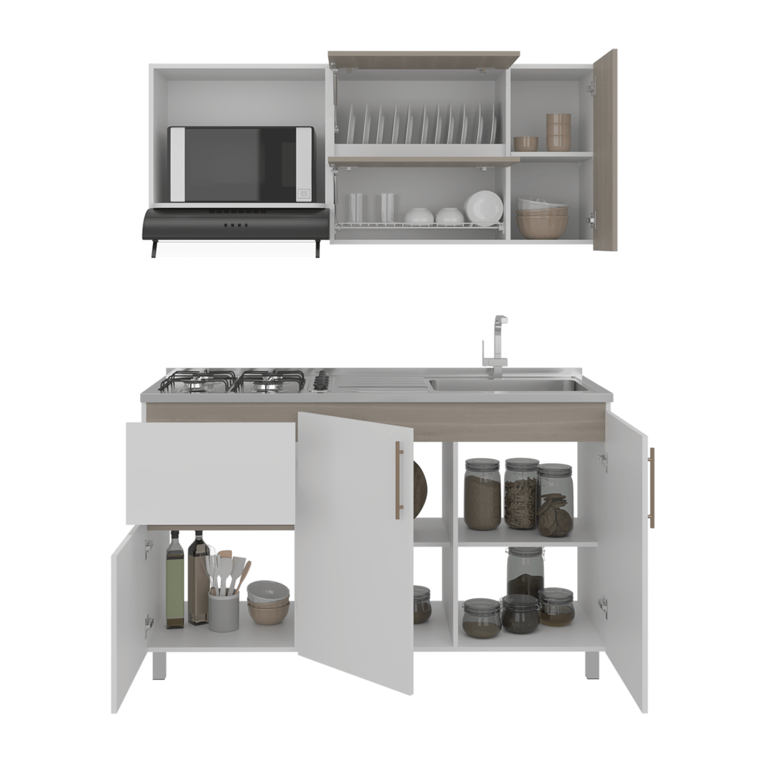 Cocina Florence Blanco y Bardolino 150x60cm con Mesón de Acero Inoxidable Pozuelo Lado Derecho y con Estufa