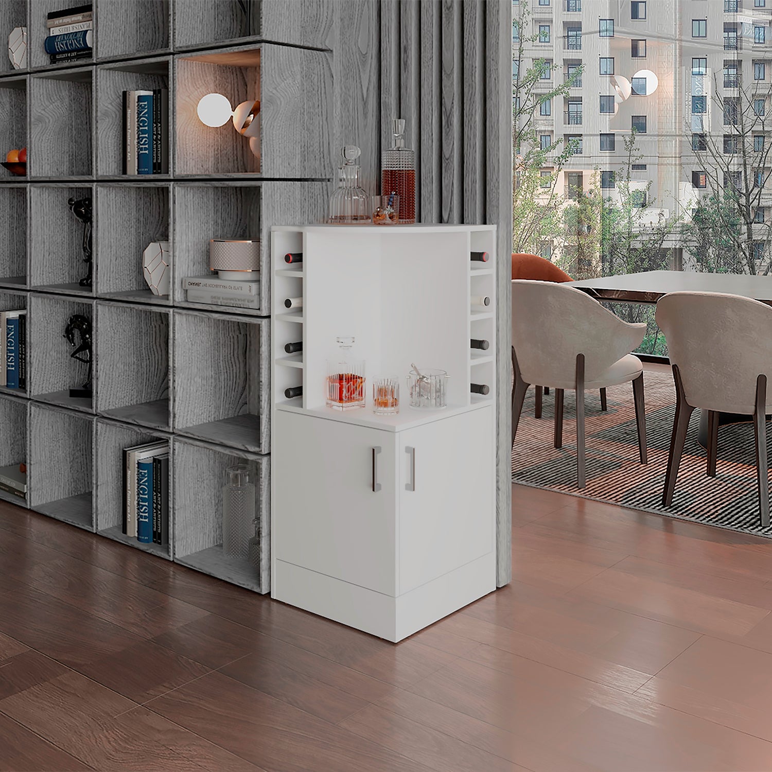 Bar Esquinero Jakes Blanco 46.9x108cm con Ocho Portabotellas y Cuatro Compartimientos