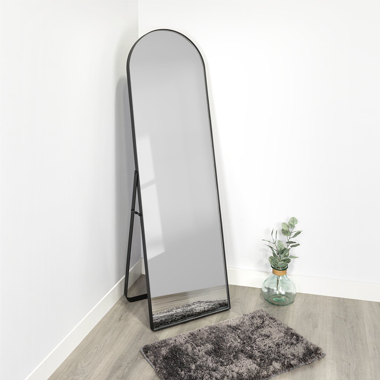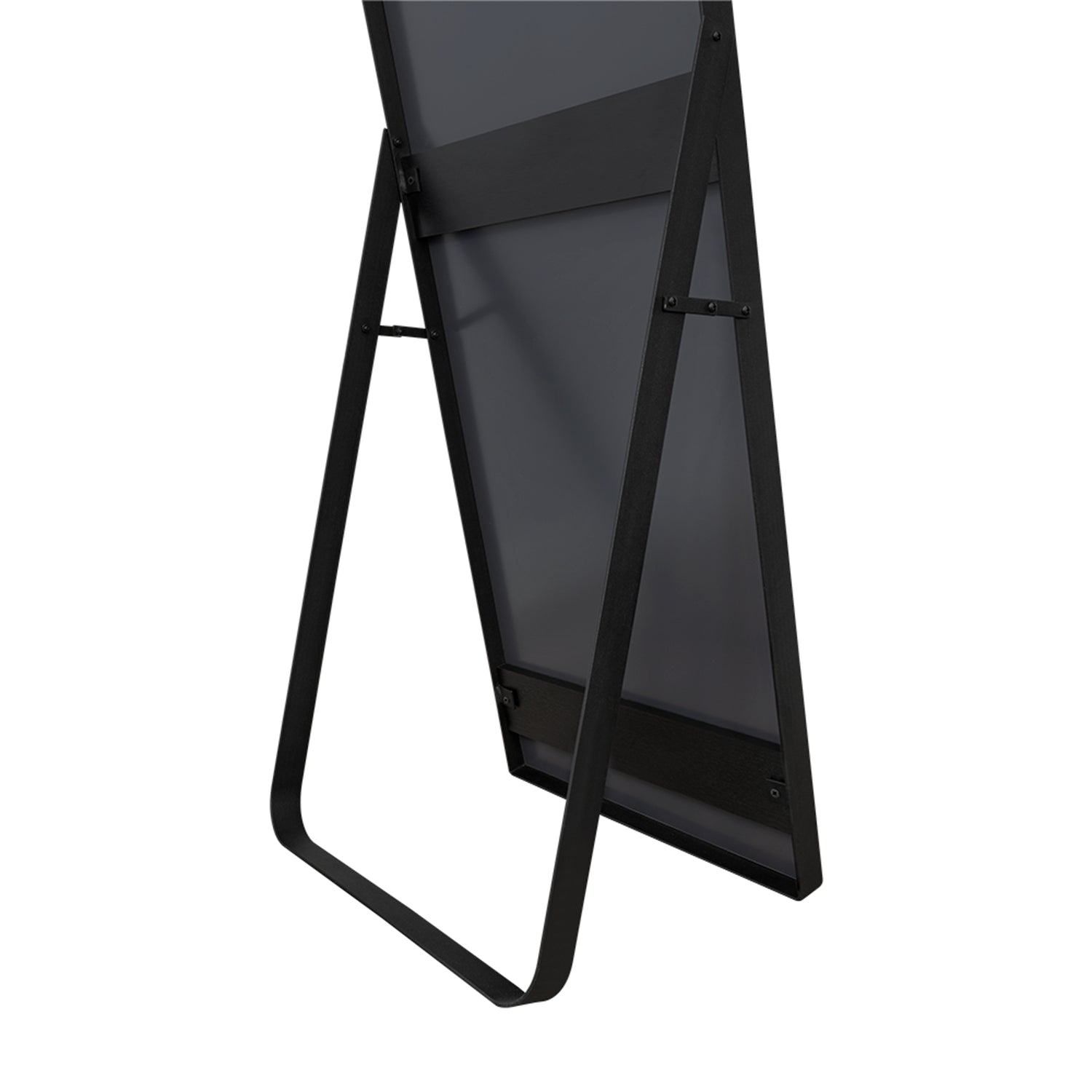 • Espejo de piso con forma rectangular y marco metálico.