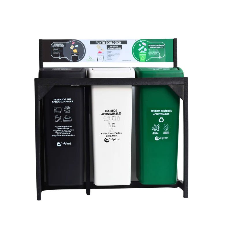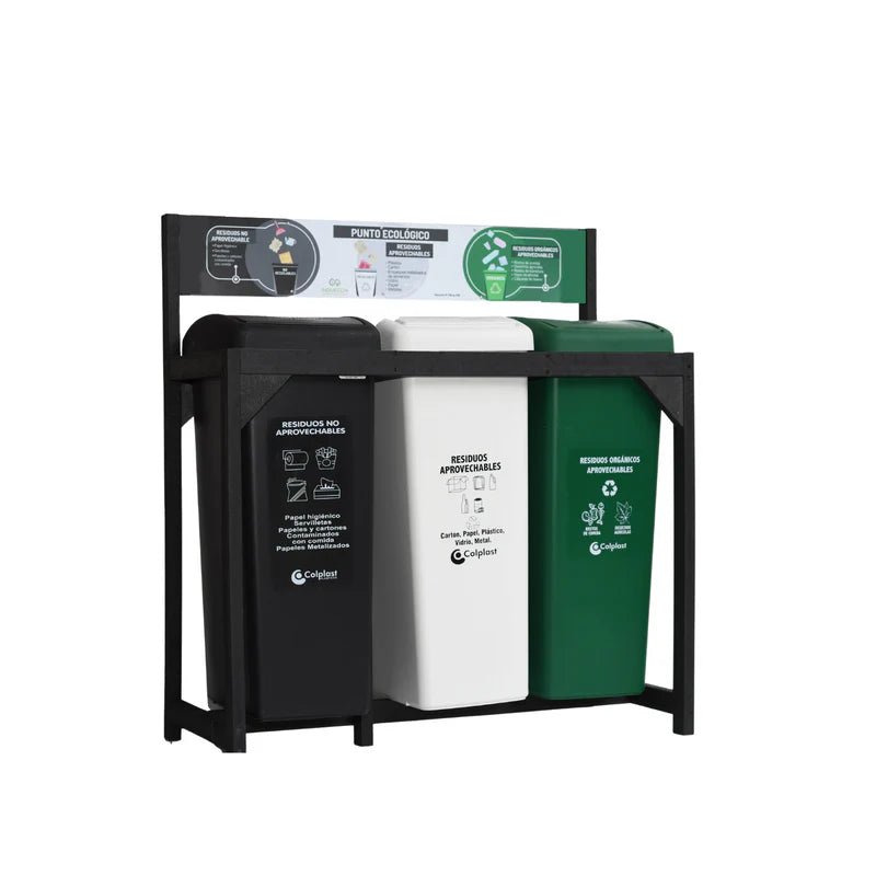 ¡Haz que tu espacio sea más ecológico y moderno con nuestro Punto Ecológico de madera plástica reciclada! Con una estructura robusta y una capacidad de 55 litros, este punto de separación en la fuente es perfecto para lugares de alto tránsito como oficinas, colegios y empresas. Además, incluye 3 canecas en colores blanco, negro y verde para una fácil identificación de los residuos. Fácil de armar y recomendado para zonas visibles, este producto también cuenta con garantía en caso de defectos de fabricación. ¡Haz tu parte por el medio ambiente con nuestro Punto Ecológico!