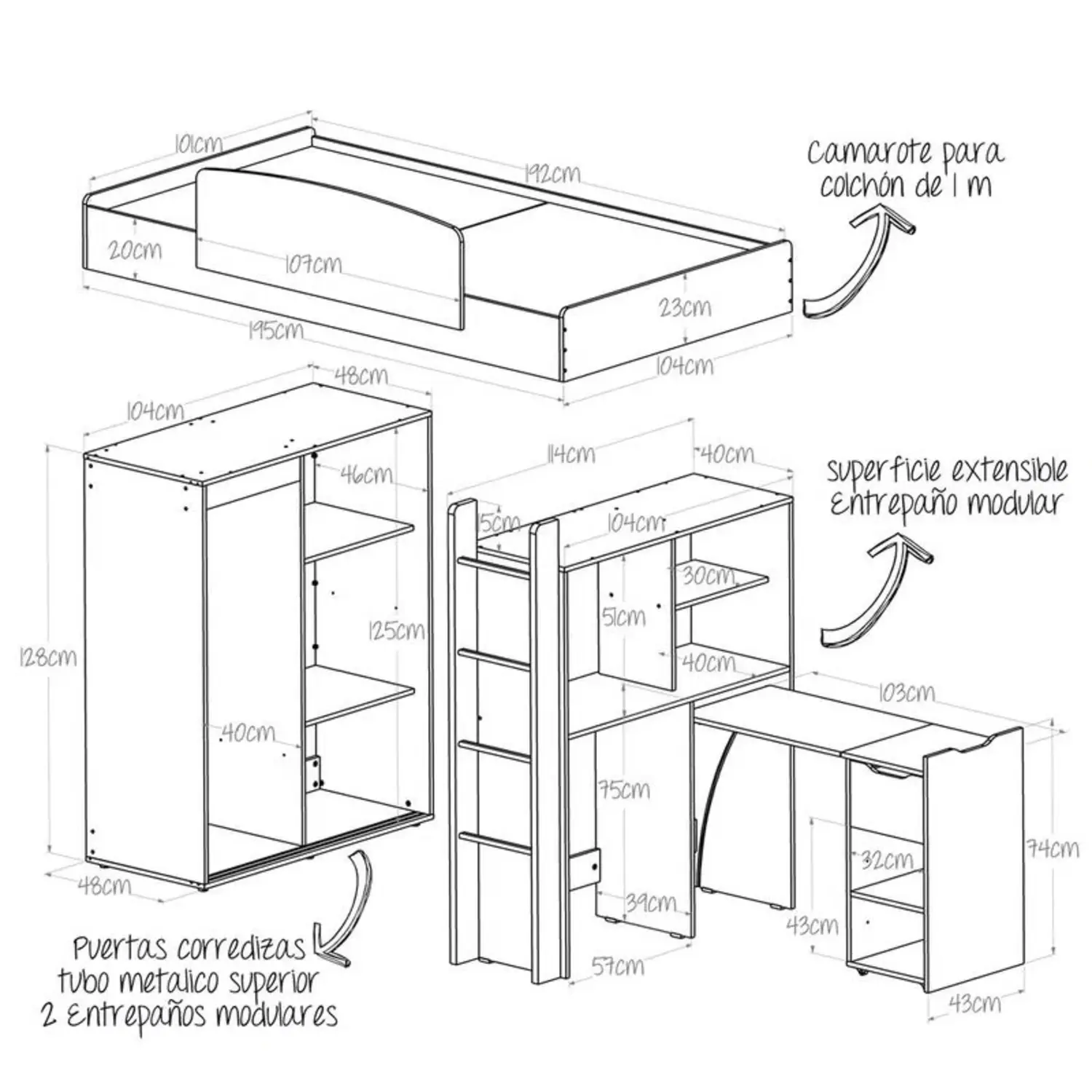 Camarote Leka 194.6x114x174.1 Duna con Escritorio y Closet