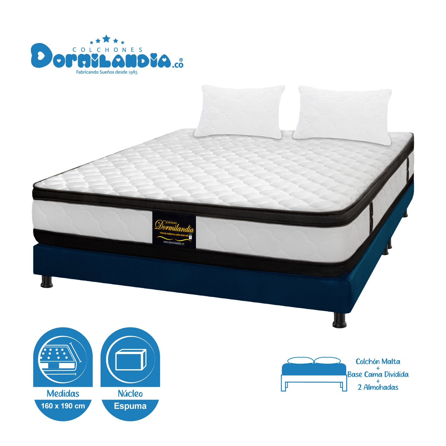Combo Base Cama y Colchón Malta Blanco y Azul Queen 160 X 190 Cm Firmeza Firme Doble Faz