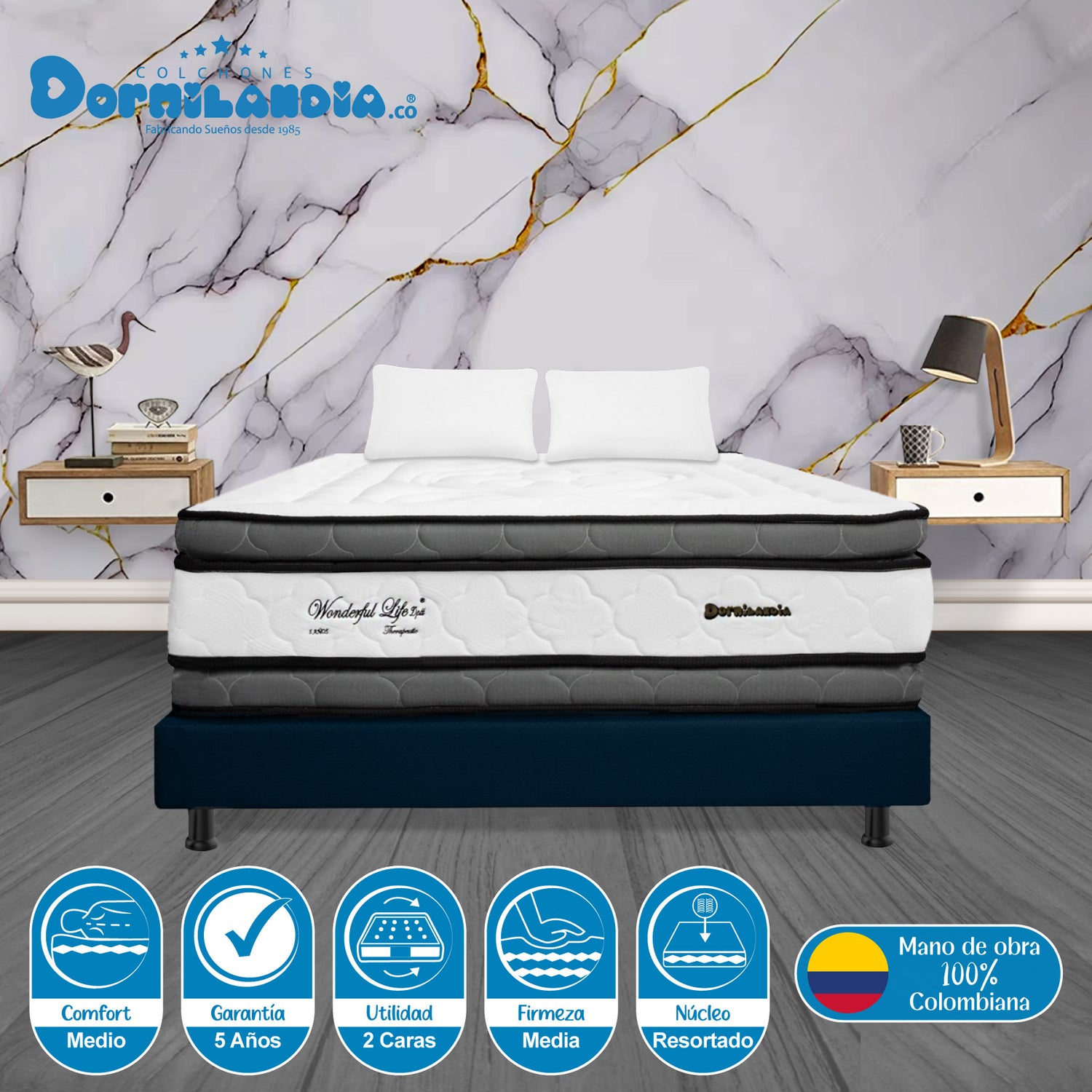 Combo Base Cama y Colchón Wonderful Blanco y Azul King 200 X 200 Cm Firmeza Medio Doble Faz