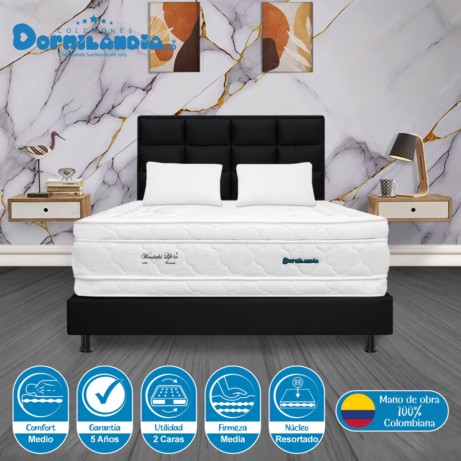 Combo Colchón Wonderful Blanco y Negro King 200 X 200 Cm Firmeza Medio Doble Faz Con Cabecero y Base Cama