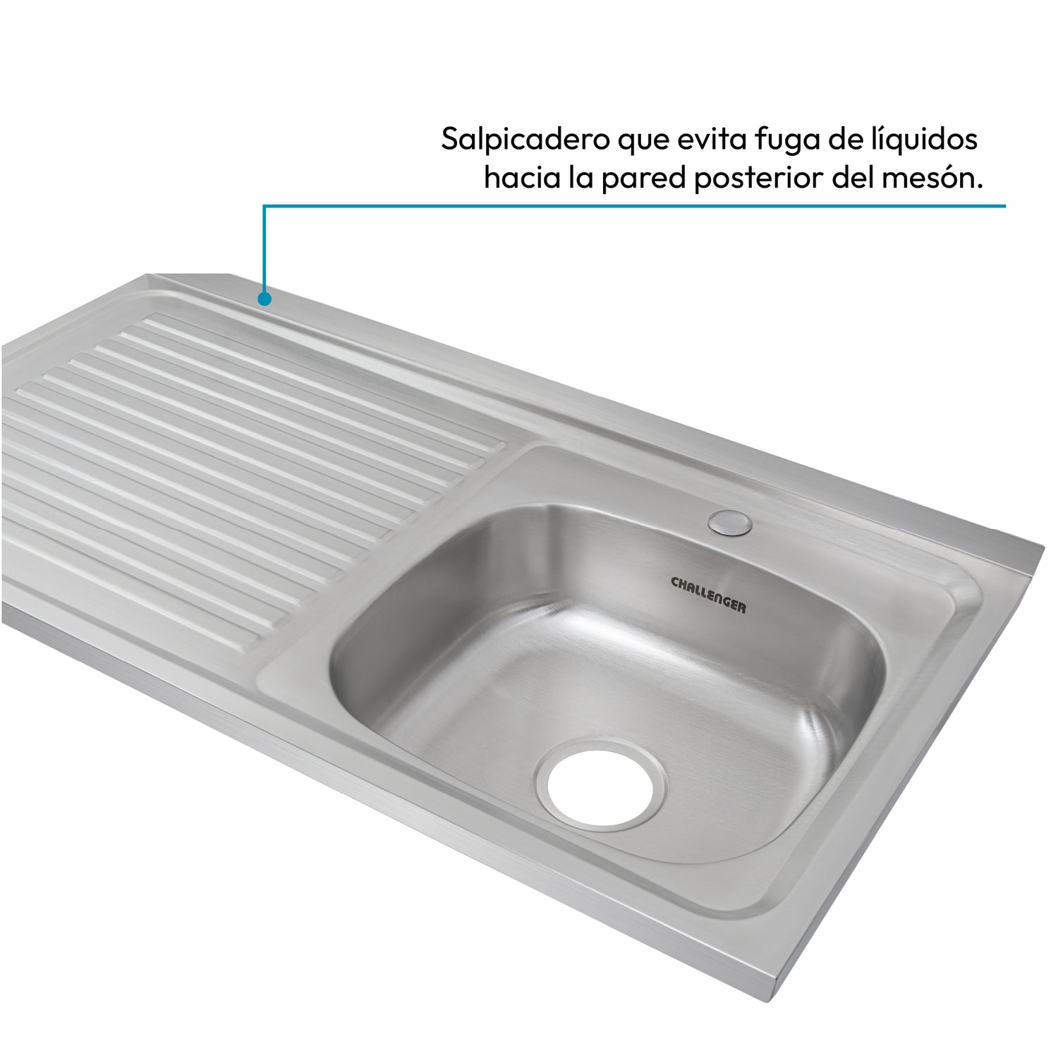 Con el Mesón de Cocina Challenger Gris, tu cocina lucirá moderna y funcional. Su salpicadero anti-fugas mantendrá tu pared limpia y seca, mientras que su amplia poceta con atenuador acústico minimiza el ruido del agua. Además, su zona de preparación inclinada permite un drenaje eficiente. Fabricado en acero inoxidable resistente a manchas y rayones, este mesón es fácil de instalar y limpiar, asegurando durabilidad y comodidad. Perfecto para cualquier cocina, este mesón viene con un pozuelo en el lado derecho y sin estufa. ¡Haz de la preparación de alimentos una tarea más fácil y elegante con el Mesón de Cocina Challenger!