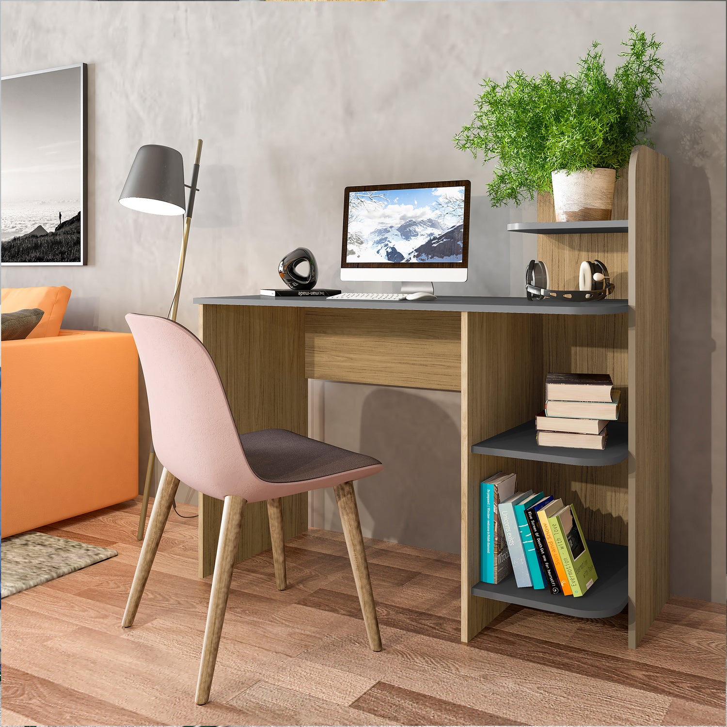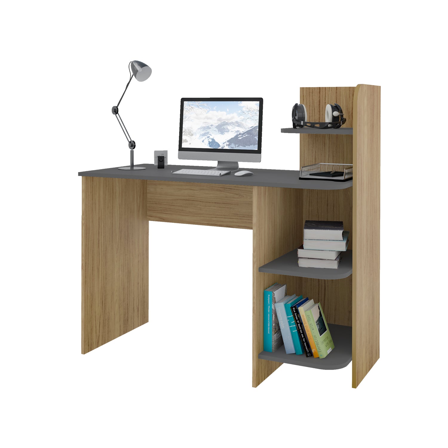 Escritorio Link Roble y Gris 111x110cm con Organizador de Libros