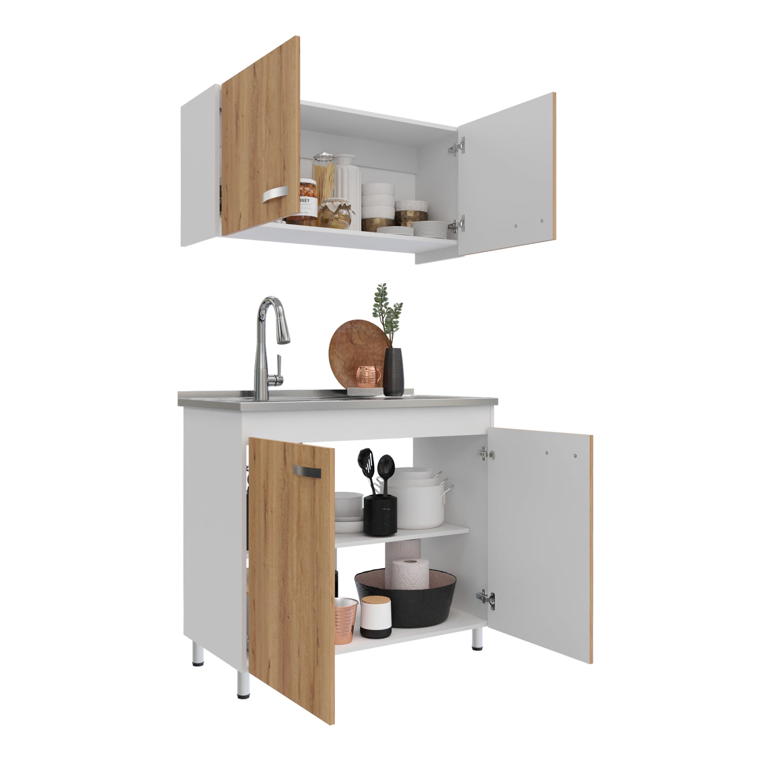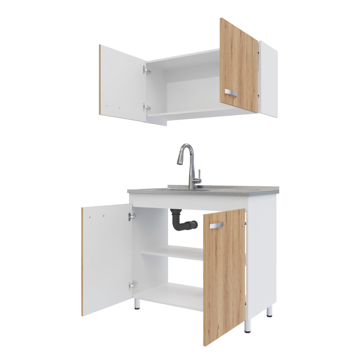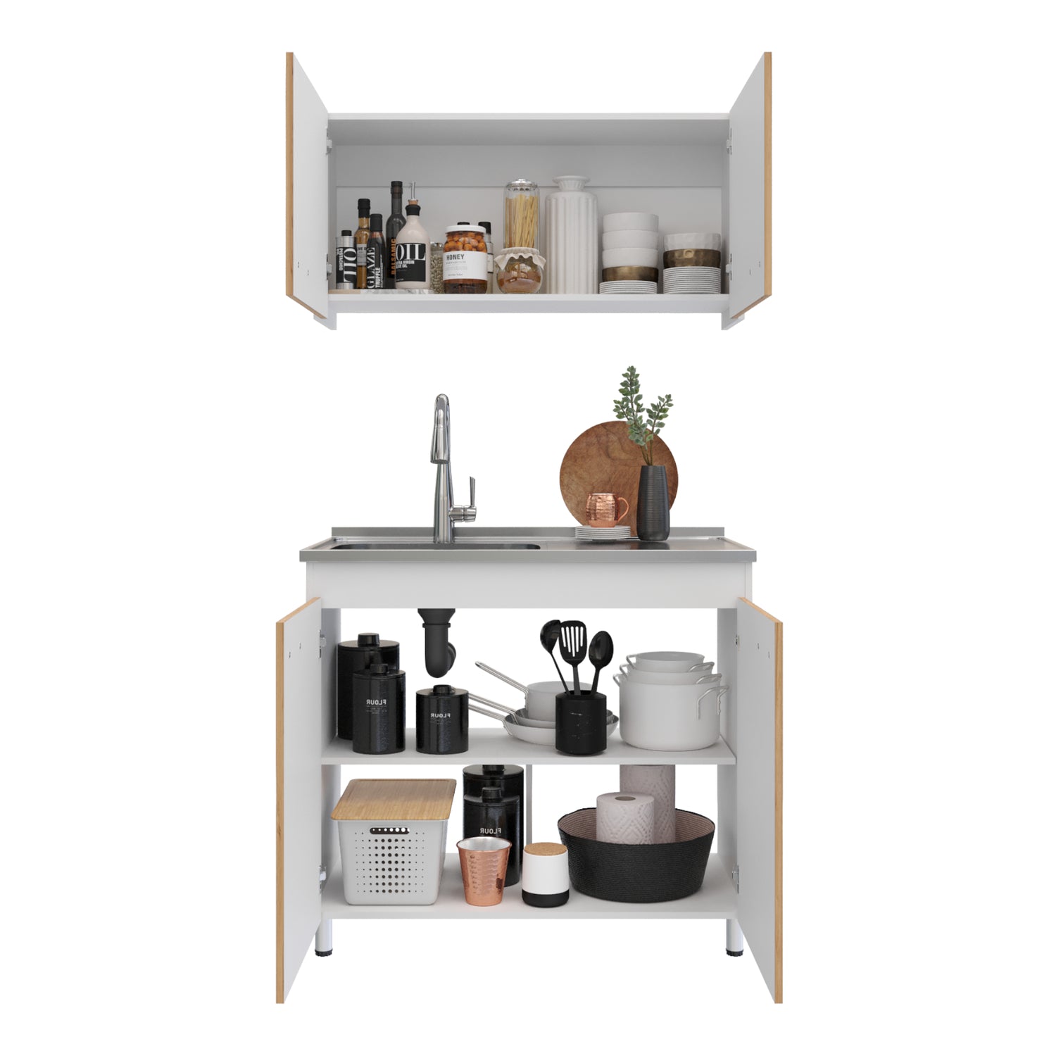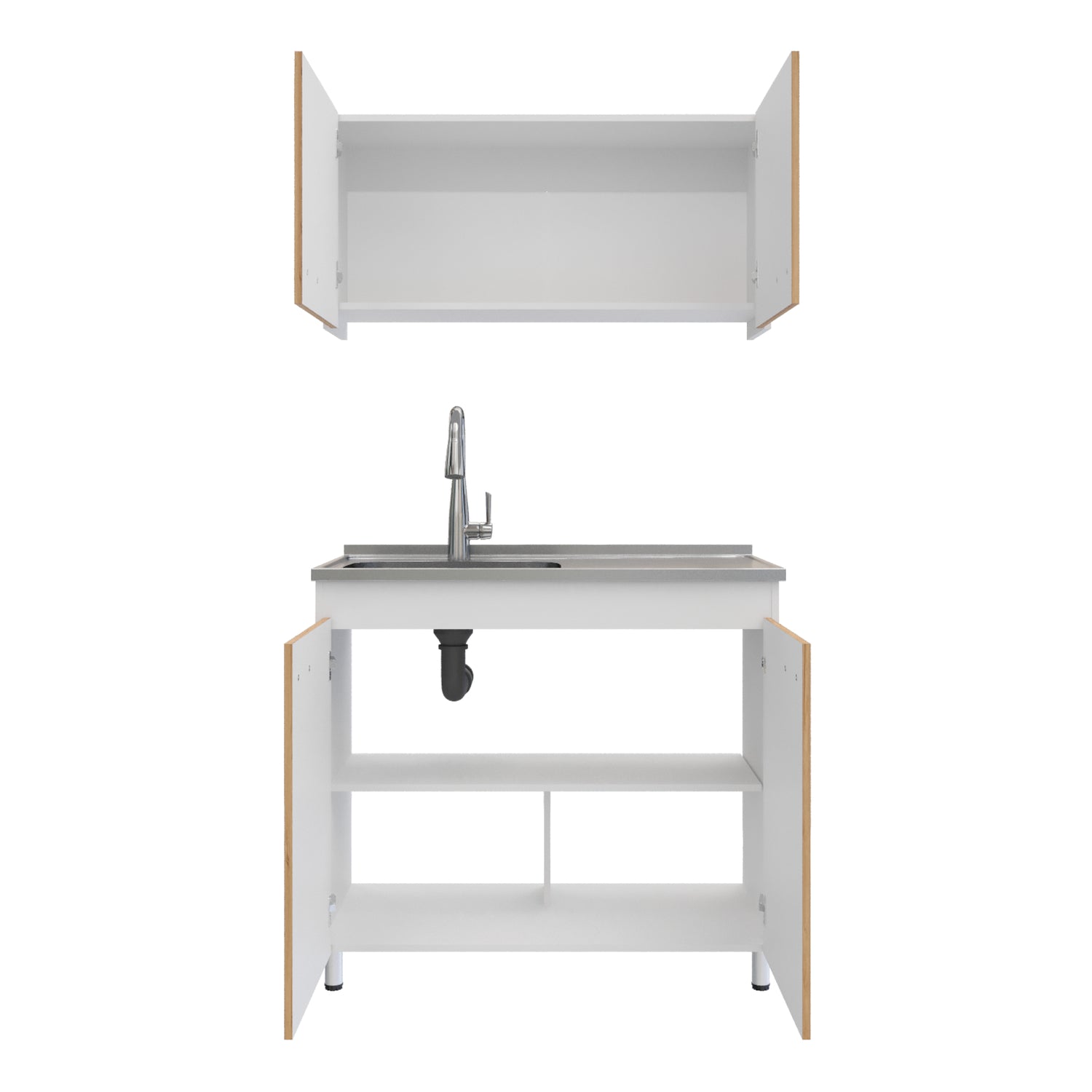 Cocina Integral Freya Blanco y Duna 100x32cm con Mesón de Acero Inoxidable para Lado Izquierdo y sin Estufa