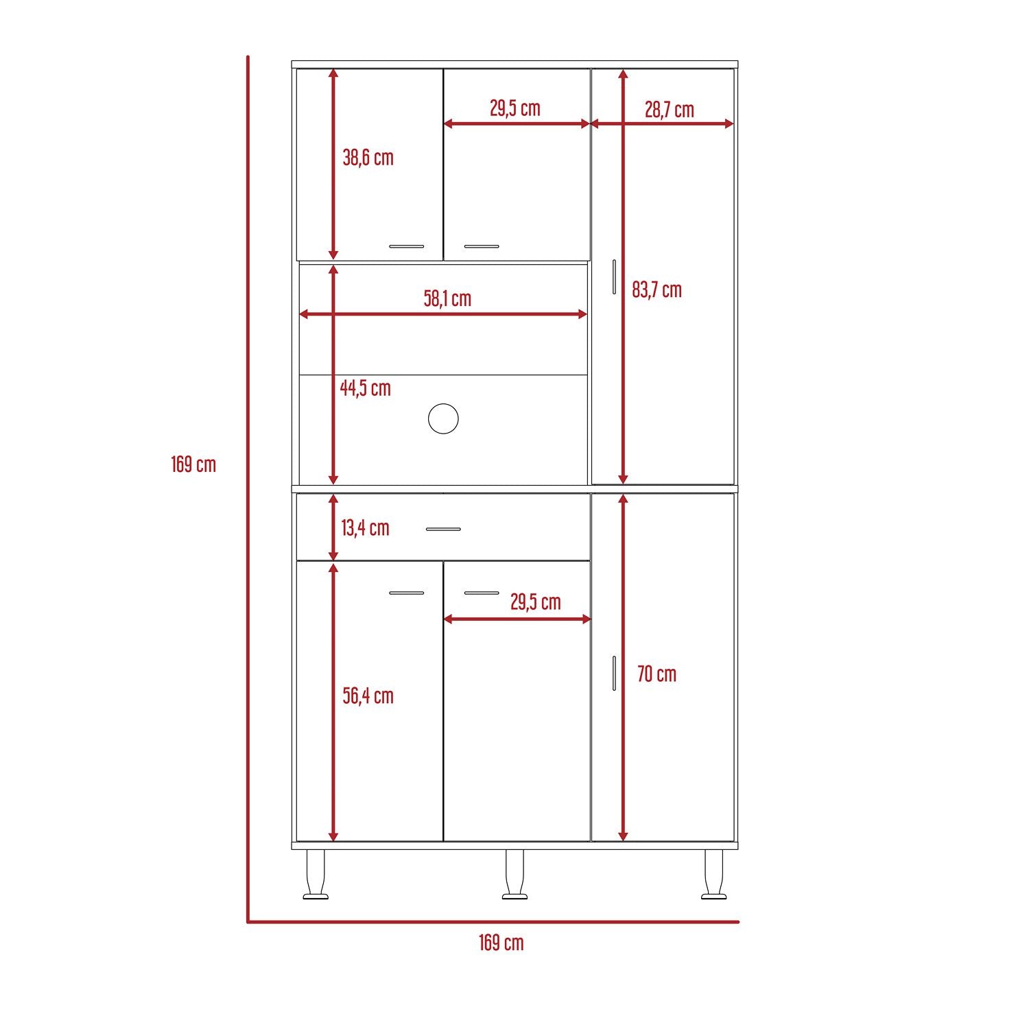 Alacena de 90 con un cajon y seis puertas abatibles, amplios espacios para almacenamiento, manijas y patas metalicas