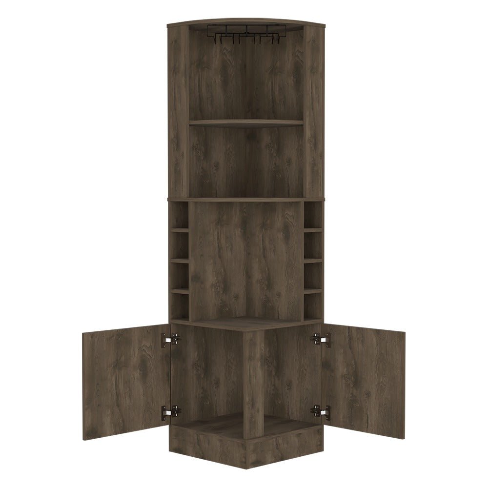 Bar esquinero con espacio superior para almacenar copas de vino, espacio para objetos decorativos, espacio para organizar licores, dos puertas batientes