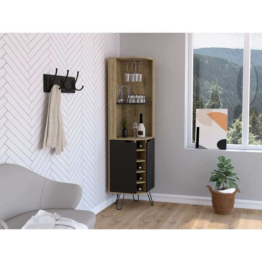 Bar esquinero con gran capacidad de almacenamiento, dos puertas, rack para botellas, colgador de copas