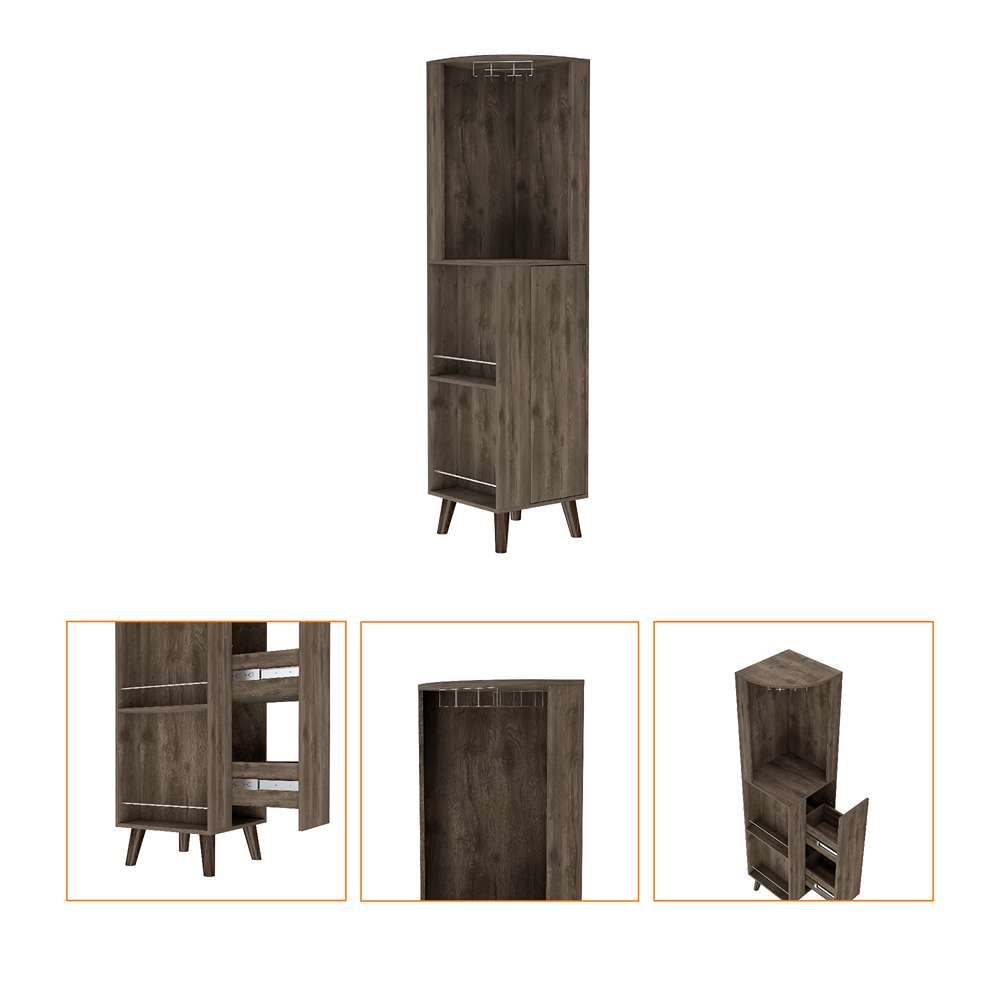 Bar esquinera espacios para organizar licores, incluye colgador de copas, sistema push para apertura de cajones, patas metalicas
