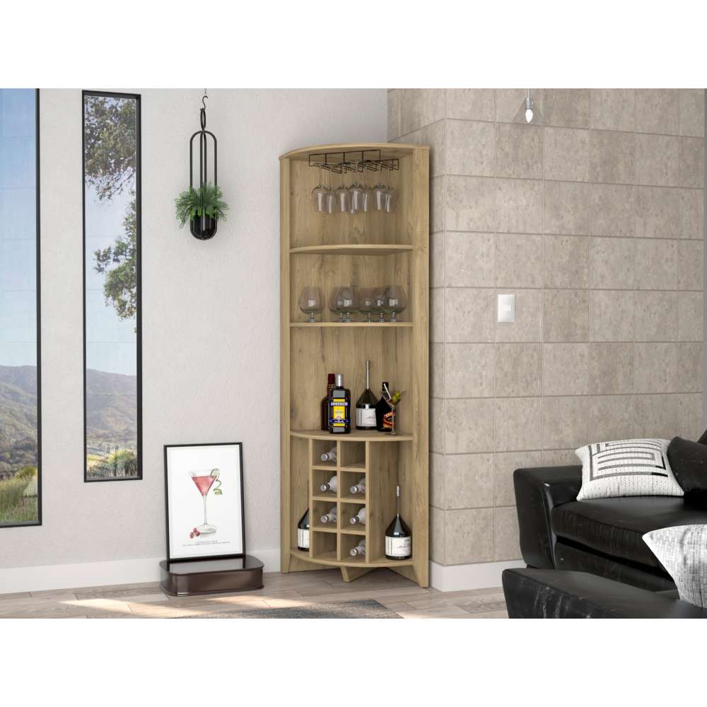 Bar esquinero incluye colgador de copas, espacios para organizar licores, espacios para objetos decorativos