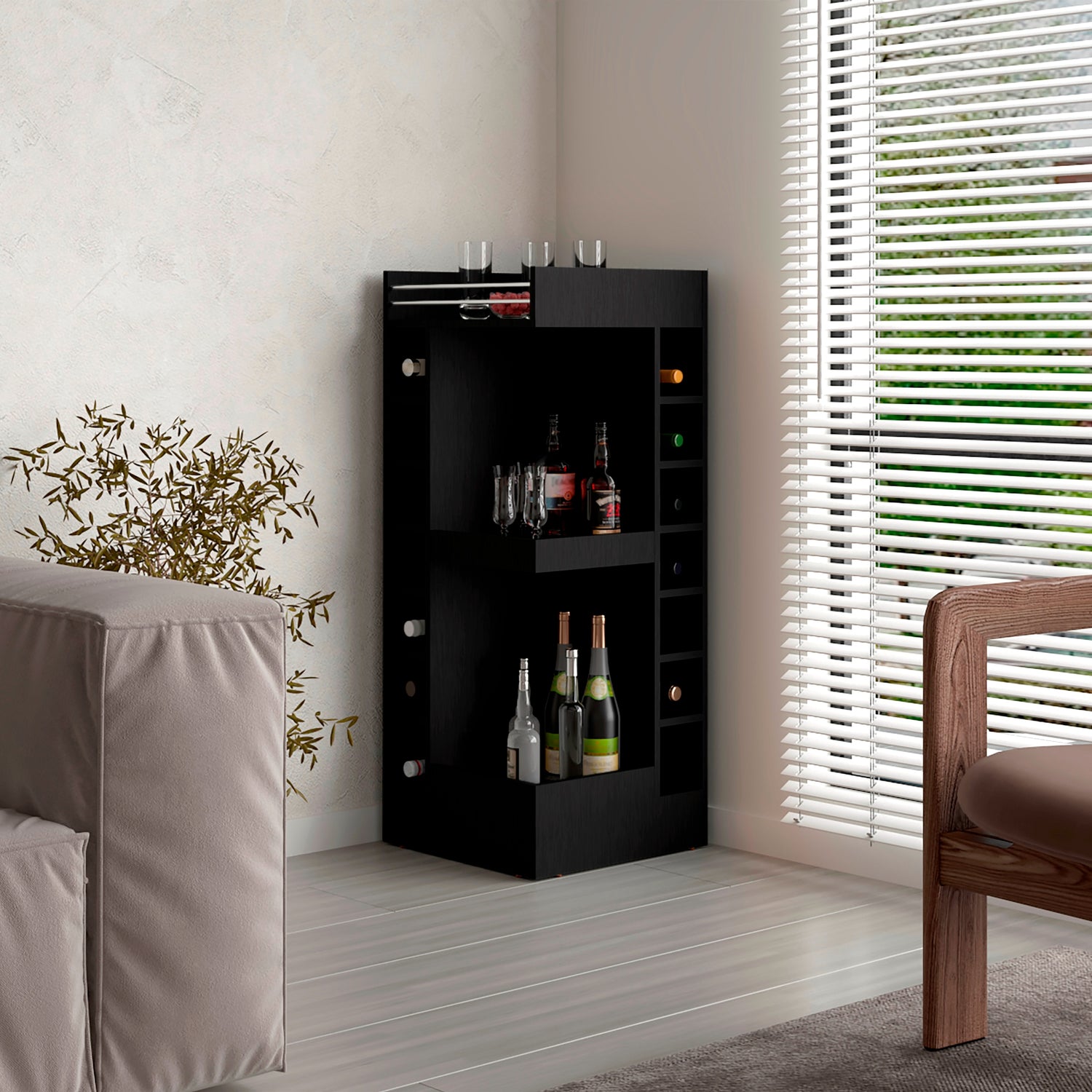 Bar Esquinero Lyman Wengue 46.6x116cm con Catorce Portabotellas y Tres Compartimientos