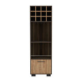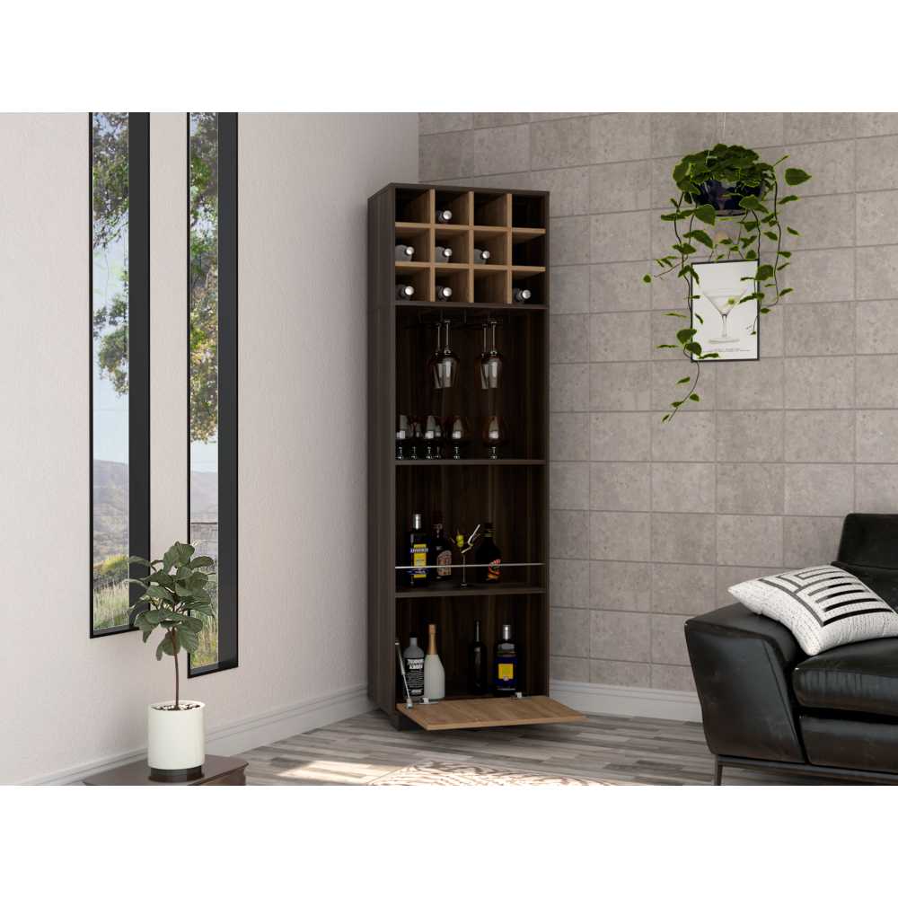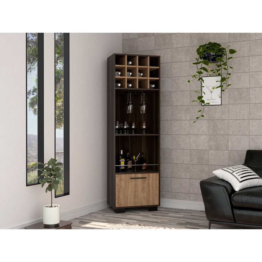 Bar con dos entrepaños para ubicar licores y vasos, espacio superior para vinos o botellas, diseño moderno con combinacion de colores