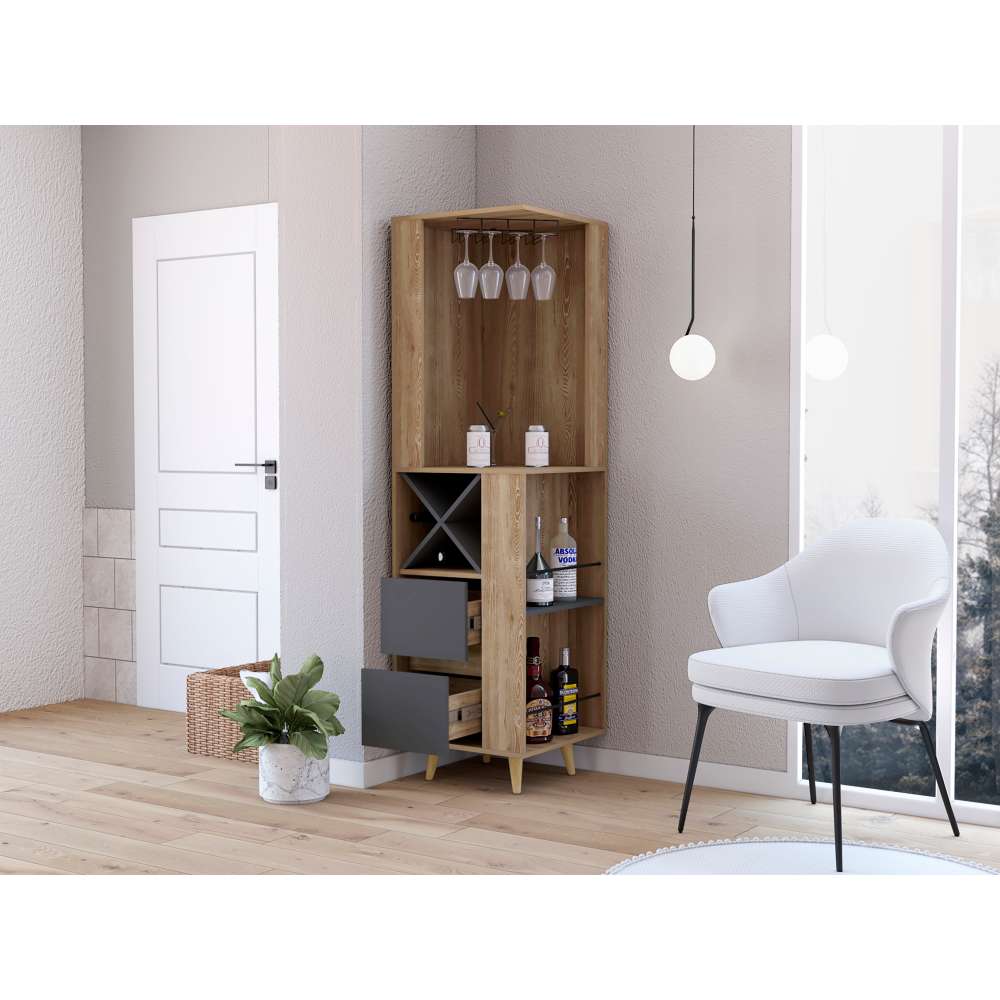 Bar esquinero con espacios para organizar licores, incluye colgador de copas, dos cajones, patas de madera, y de diseño moderno