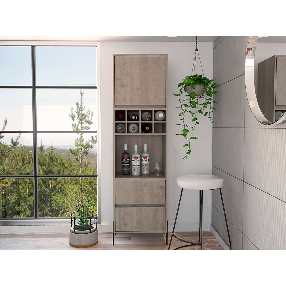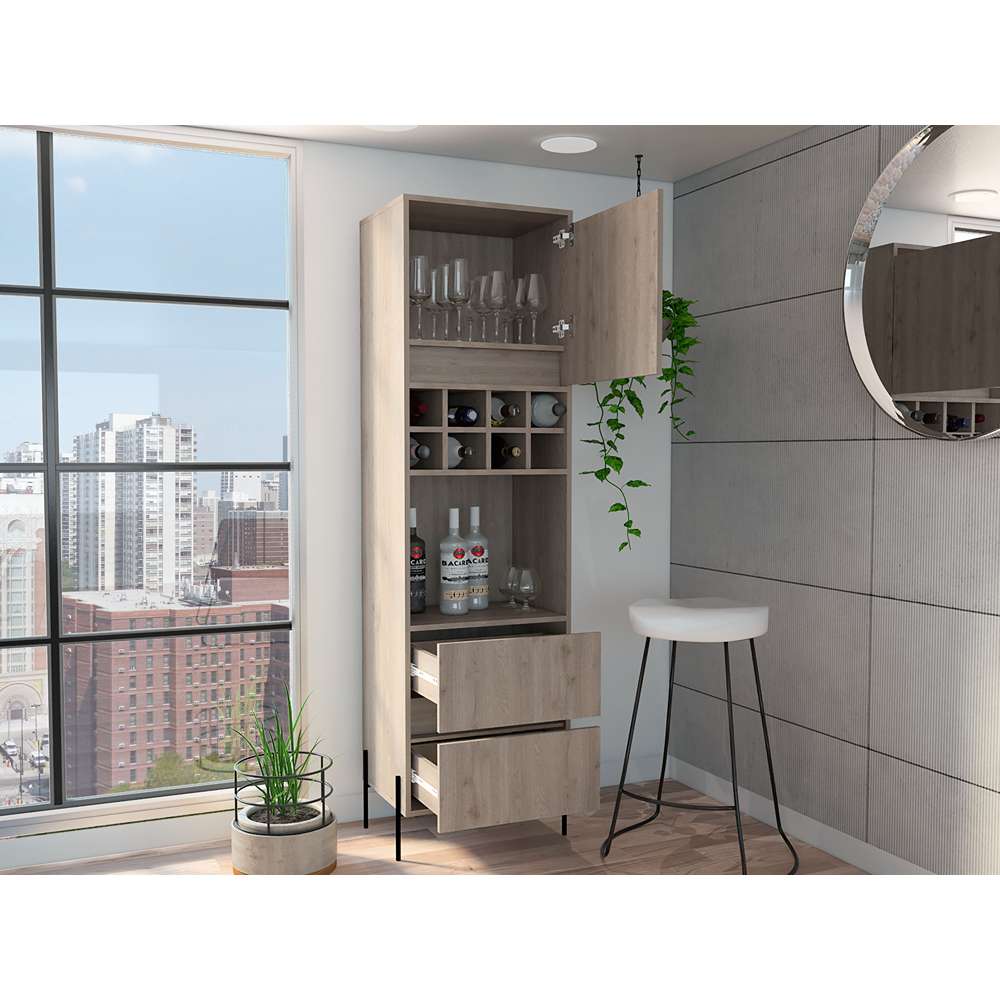 Mueble bar con espacio para colocar objetos decorativos, espacio para organizar licores, dos cajones, patas metálicas en acero negro