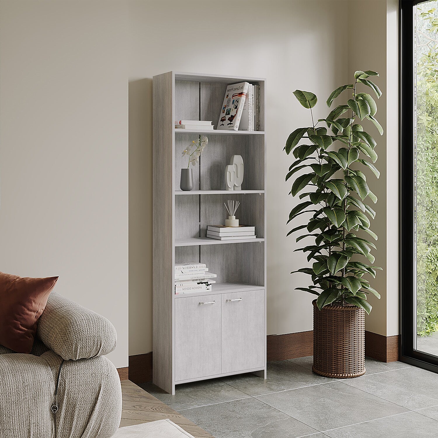 Biblioteca Lisa Cemento 63x180cm Rectangular con Cuatro Entrepaños y con Cinco Compartimientos