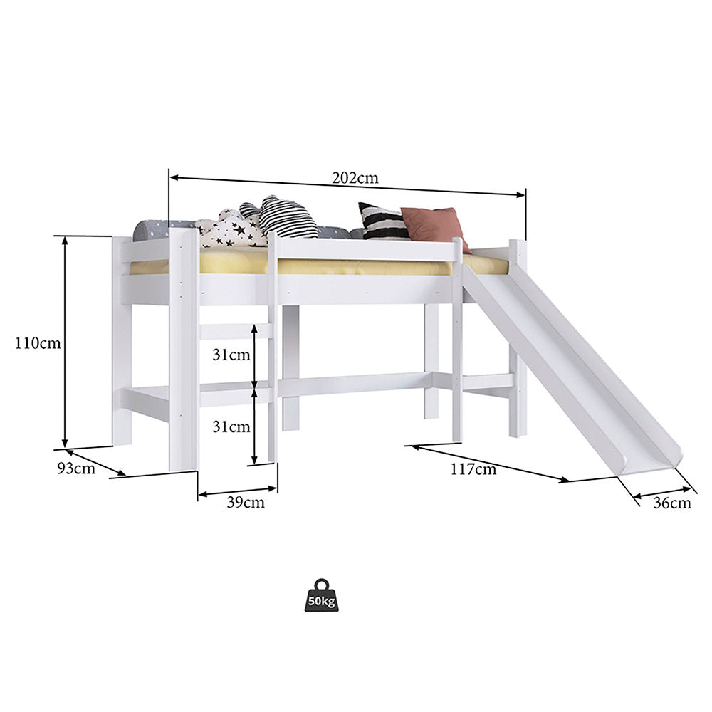 La Cama Marcela tiene diseño moderno que proporciona un ambiente de diversión a la habitación de los pequeños. Cuenta con una escalera, un rodadero y un espacio que sirve como zona de juegos. Ha sido producido con aglomerado de madera que garantiza mayor resistencia y durabilidad. Con sus productos, Muebles 2020 quiere generar ideas para darle una nueva vida a los hogares. Cada mueble es una mezcla de creatividad, diseño, funcionalidad y mucha dedicación. Alto: 110 cm Largo: 202 cm Prof: 210 cm MDP BP Peso recomendado 50 Kg Recomendado para un colchón de 190 x 90 cm Incluye: - Una (1) escalera - Un (1) rodadero - Kit de herrajes - Manual de armado No incluye: - Accesorios - Colchón - Cortina - La garantía aplica para defectos de fabricación por 1 año. - Producto ambientado, no incluye accesorios. - El color de la imagen es de referencia y puede tener variaciones en el producto real. - Se recomienda que el producto sea armado por un experto, o en su defecto que se usen las herramientas adecuadas, según lo establecido en el manual de armado. - Si el cliente decide armar él mismo el mueble, en caso de daño por una instalación indebida, o no tomando en cuenta las instrucciones señaladas en el documento de instrucciones de armado, deberá cubrir el costo de reparación.