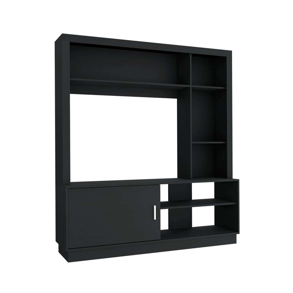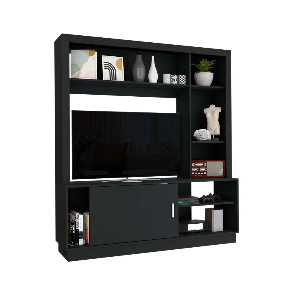 Centro de entretenimiento para 42'' maximo, espacios para ubicar equipos de audio y video, espacios laterales y superior para colocar objetos decorativos, manija metalica, una puerta inferior corrediza
