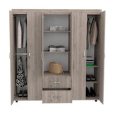 Este clóset está esperando relucir en tu habitación. Su color ceniza aporta elegancia a tu espacio. Tiene cuatro puertas y dos cajones con manija metálica. Al abrirlo podrás encontrar siete compartimientos para que ubiques tus pertenencias. También incluye tres tubos metálicos que te permitirán colgar tu ropa favorita. Cuenta con topes antideslizantes en su base para brindar estabilidad.