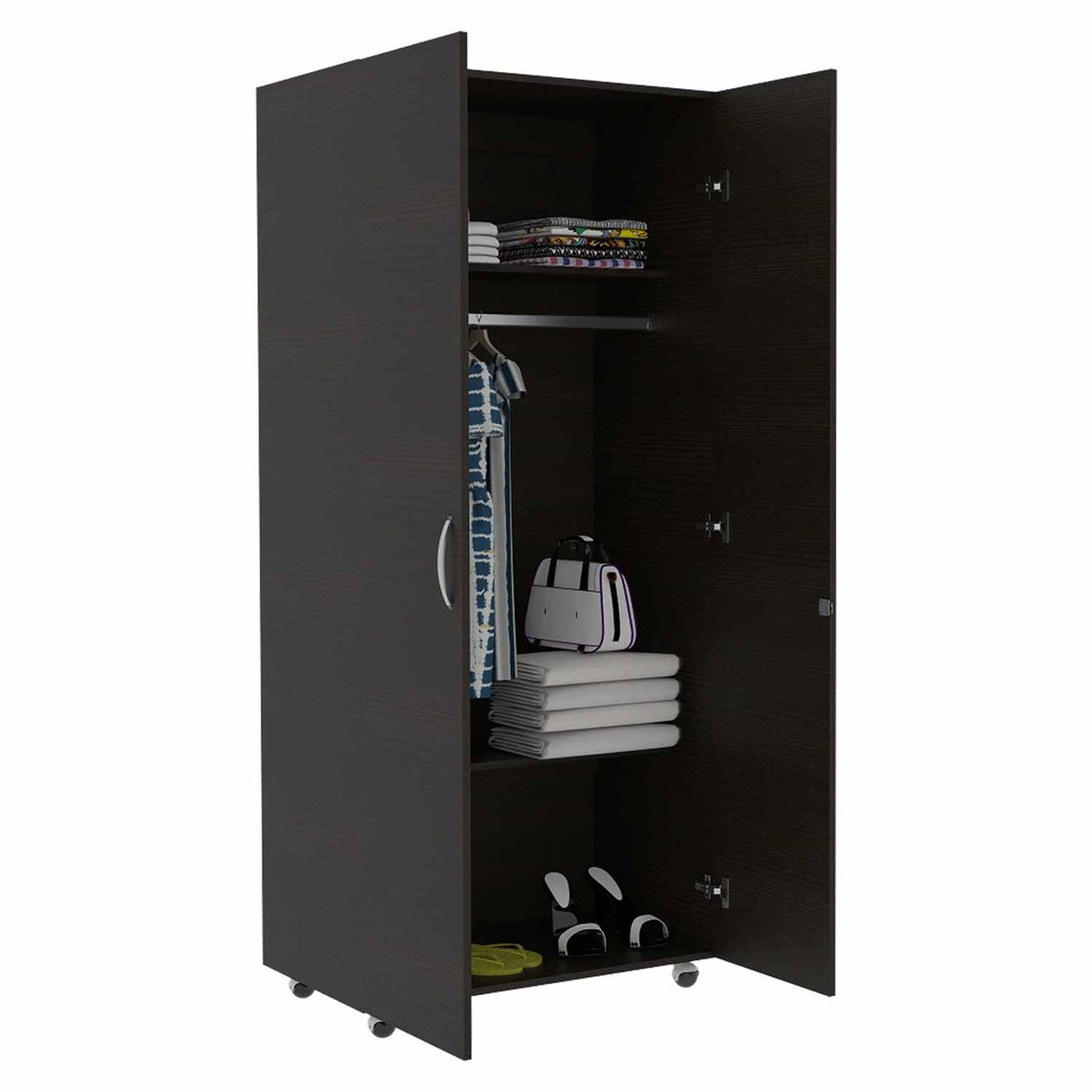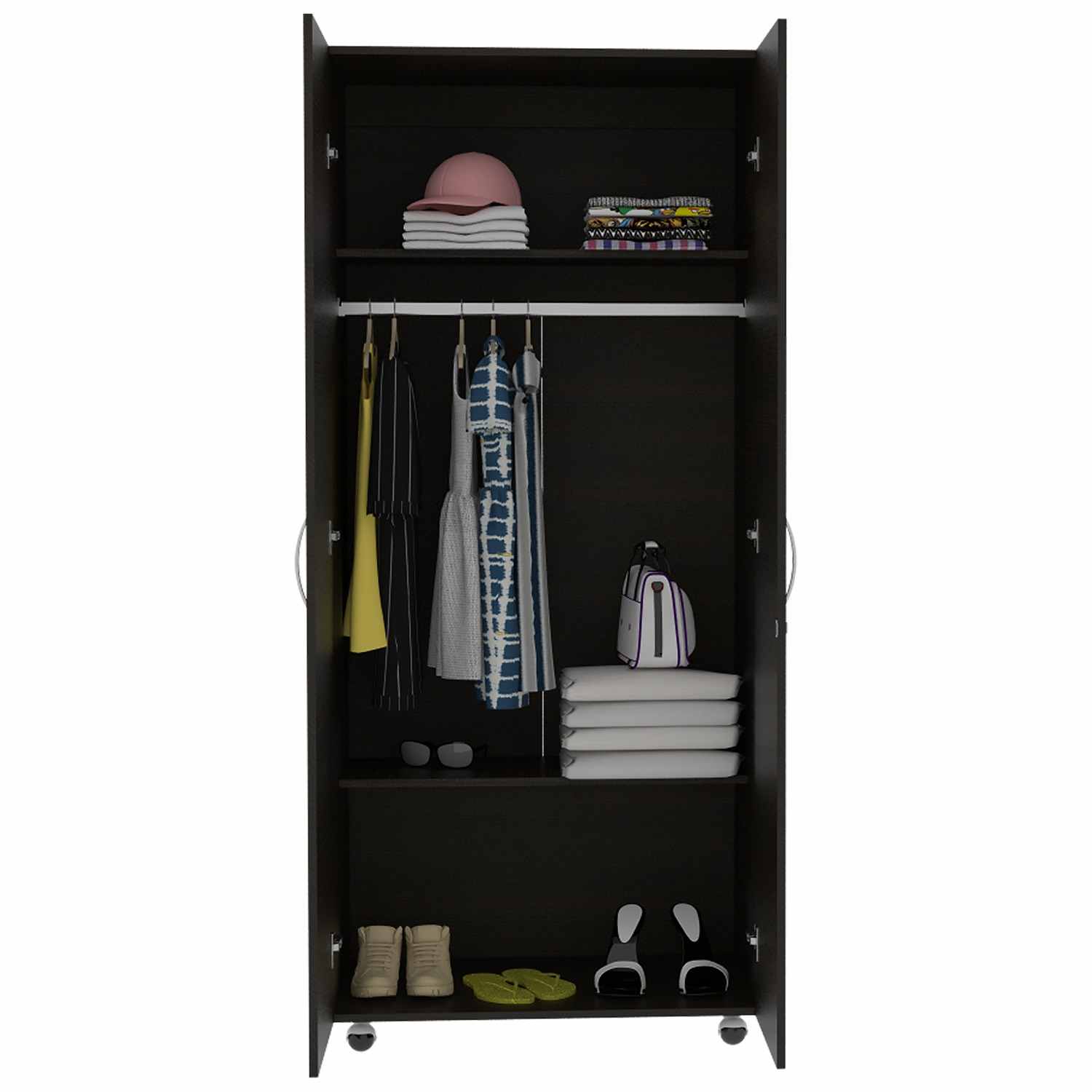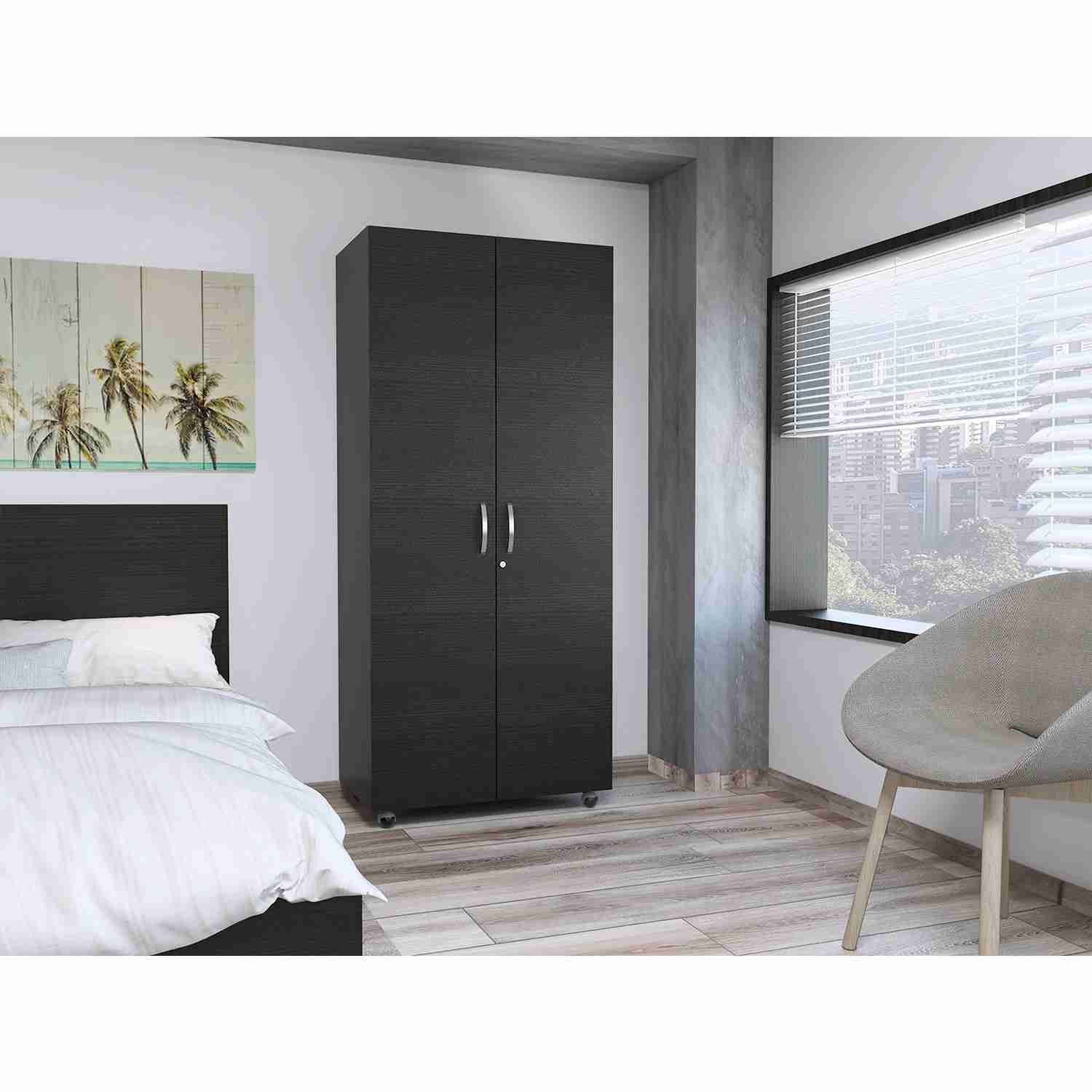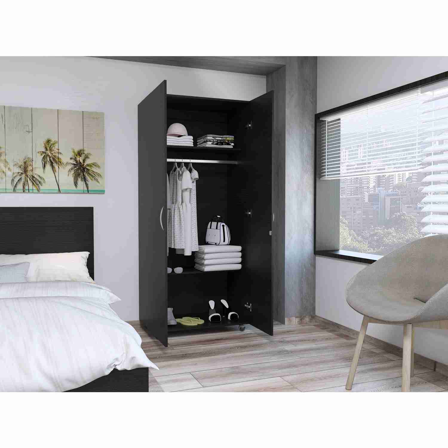 Ropero con dos puertas abatibles, tubo para colgar prendas, entrepaños para organizar