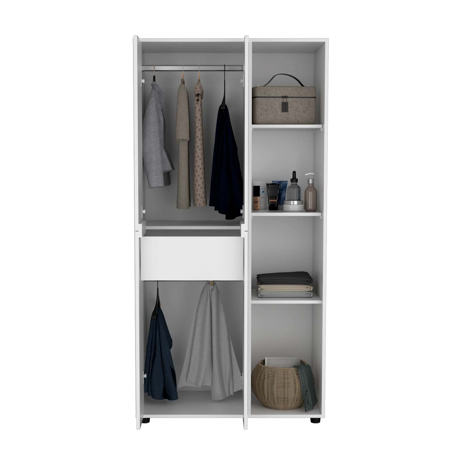 Armario con dos tubos, un cajon oganizador interior, amplios espacios para guardar ropa