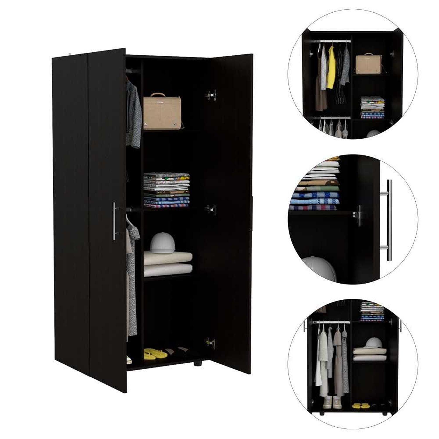 Closet con dos puertas batientes, dos tubos cromados para colgar prendas, tres entrepaños para organizar