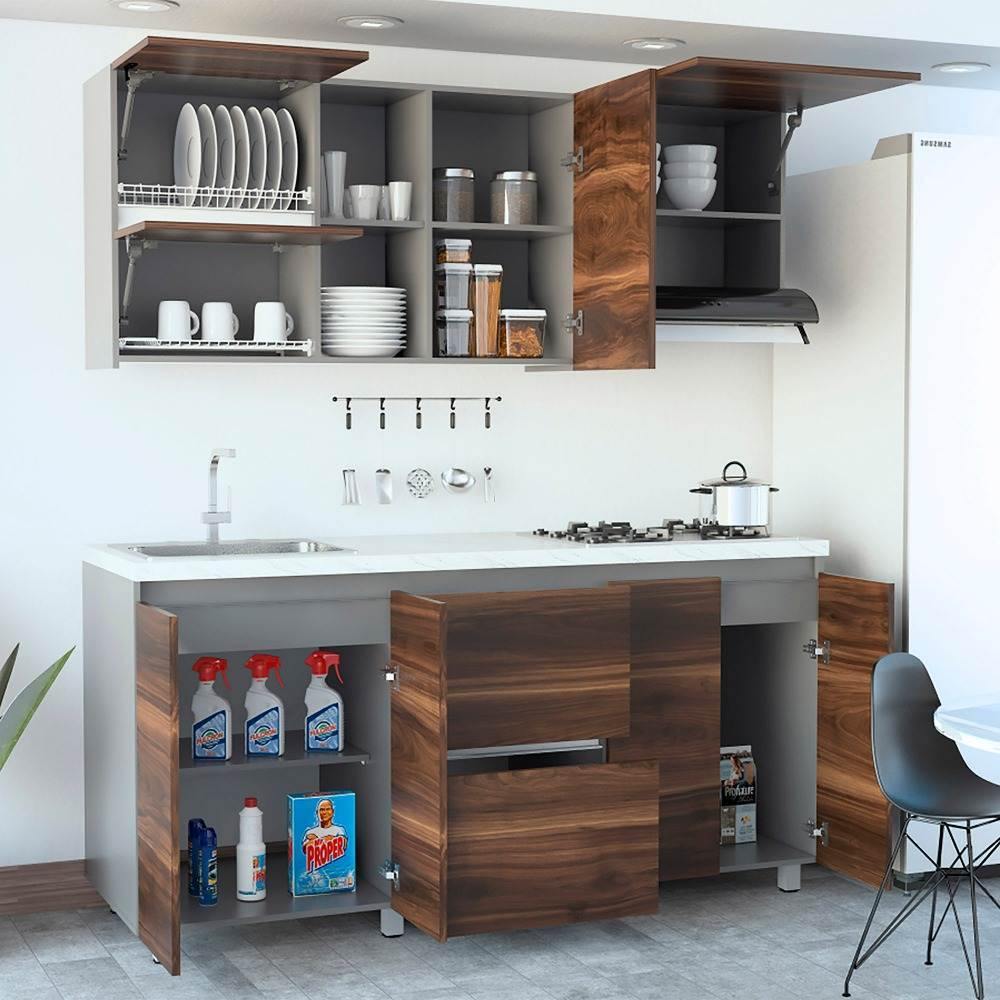 Dale exclusividad y modernidad a tu hogar con la cocina Bianca. Su color Habano da una sensación de un ambiente fresco y agradable para cocinar. El gabinete superior tiene tres puertas batientes y una abatible. Incluye locero y portavasos color blanco.También un módulo para campana extractora derecha de 60 cm y manija de perfil retraída. El gabinete inferior tiene cuatro puertas abatibles, dos cajones, patas metálicas, manija de perfil retraída. No incluye mesón, campana, grifería ni elementos decorativos