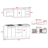 Cocina con mueble superior con amplios espacios para guardar alimentos e implementos de cocina, cuatro puertas abatibles, manijas metalicas, mueble inferior con cinco puertas abatibles, dos cajones, ocho patas, manijas metalicas, incluye meson derecho