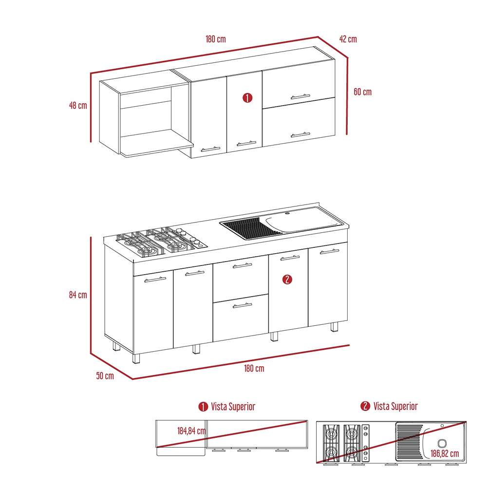 Cocina con mueble superior con cuatro puertas batientes, incluye locero y portavasos, modulo para campana extractora de 60cm, manijas metalicas, en la parte inferior con cinco puertas batientes y un cajon, manijas y patas metalicas, amplios espacios para guardar alimentos electrodomestivos u otros