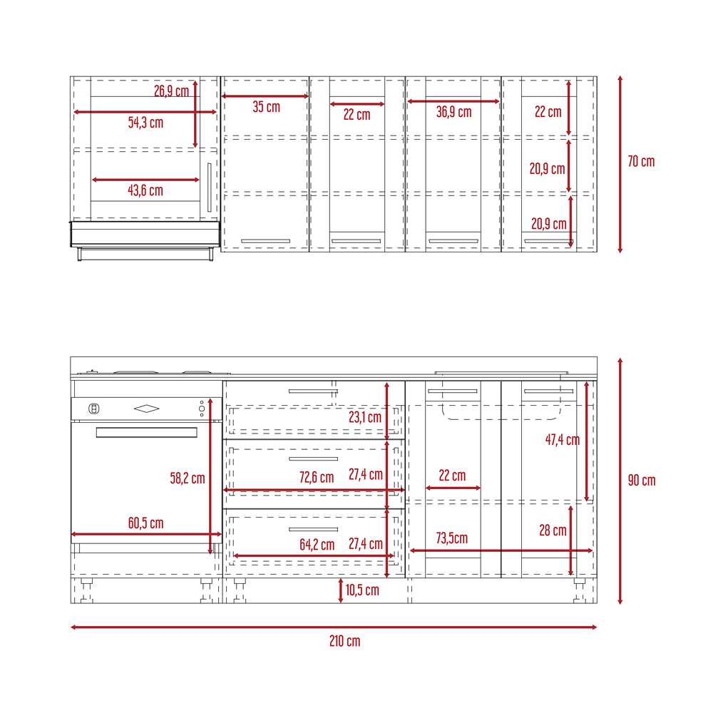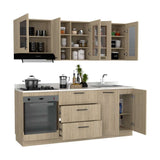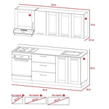 Cocina en la parte superior con cinco puertas abatibles, incluye campana extractora, espacios amplios para guardar alimentos e implementos de cocina, manija metalica, en la parte inferior posee dos puertas abatibles, tres cajones, patas y manijas metalicas, sirve para meson derecho, incluye lavaplatos, cubiera y horno