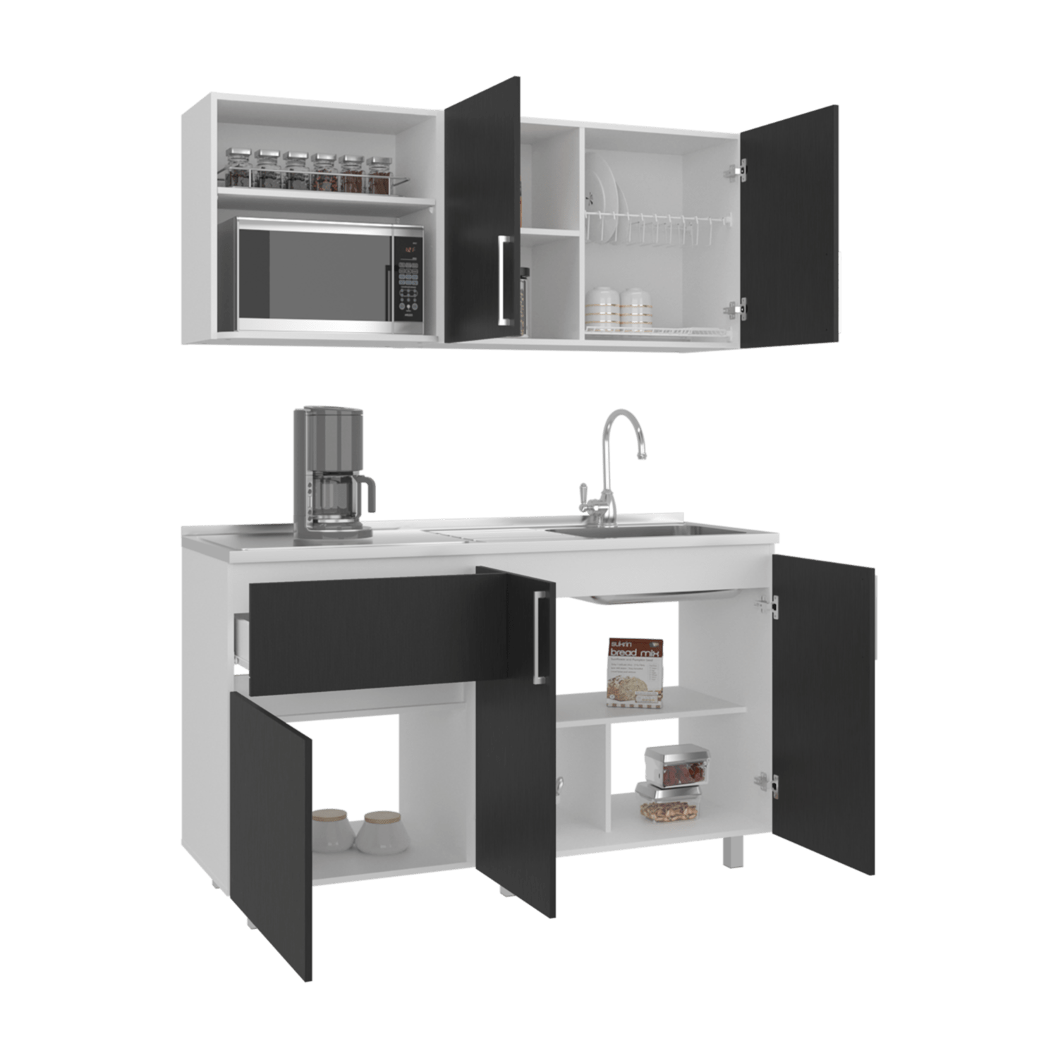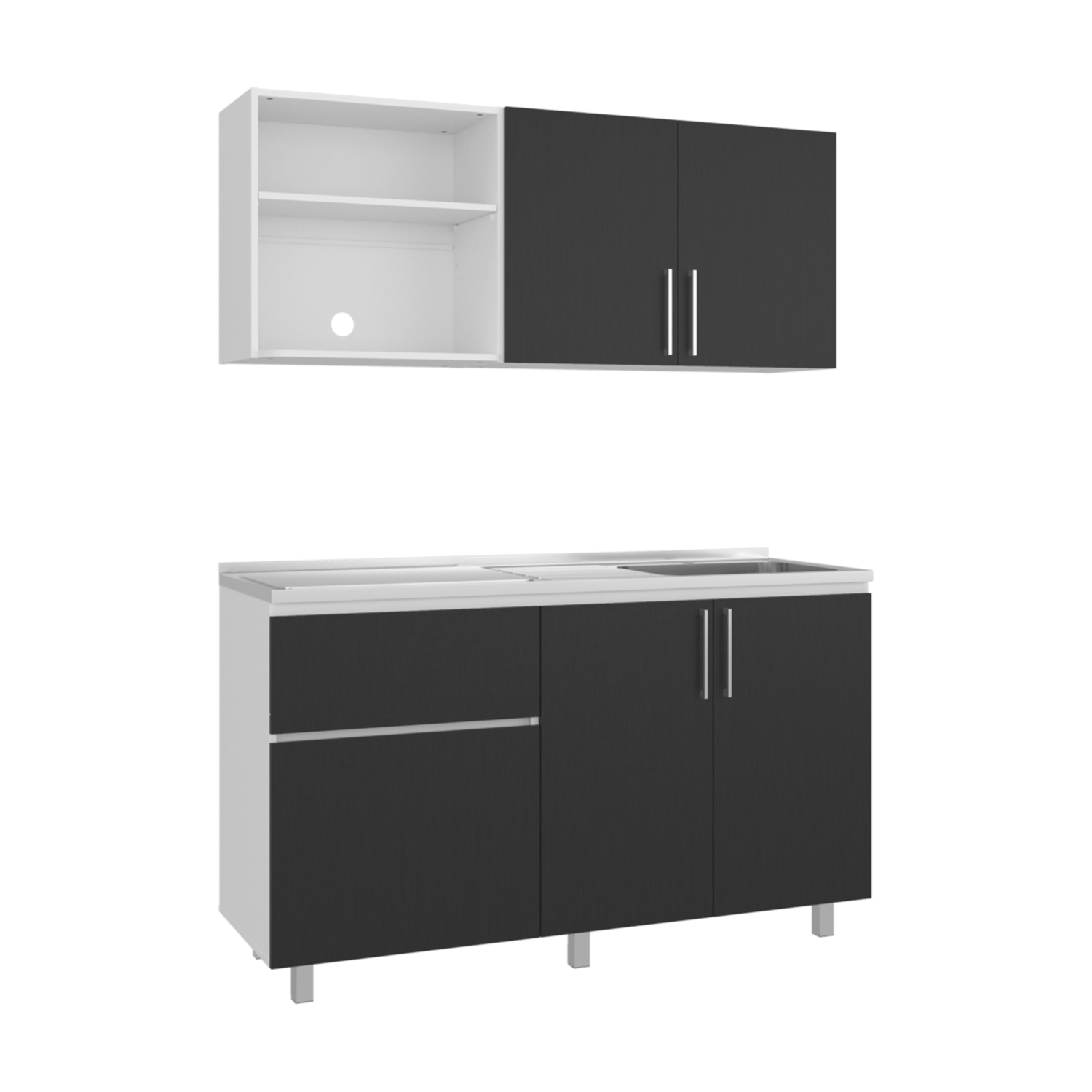 Cocina Allen Blanco y Wengue 150x60cm con Mesón de Acero Inoxidable y Pozuelo Lado Derecho