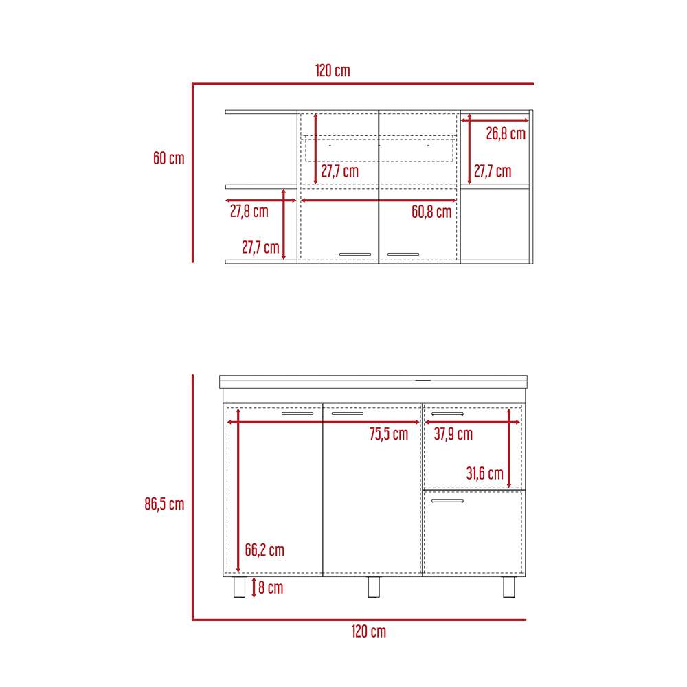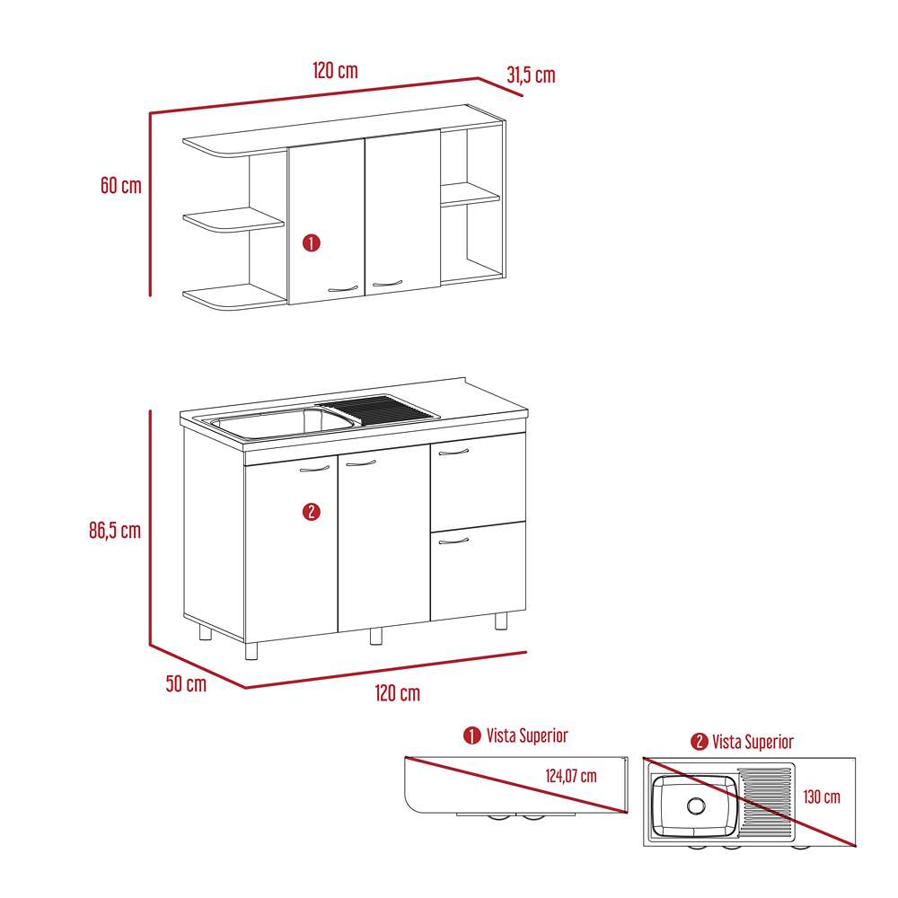 Cocina de 120 en la parte superior espacios amplios para guardar alimentos e implementos de cocina, dos puertas abatibles y manijas metalicas, en la parte inferior cuatro puertas abatibles, series patas, manijas metalicas, incluye meson izquierdo de facil instalacion