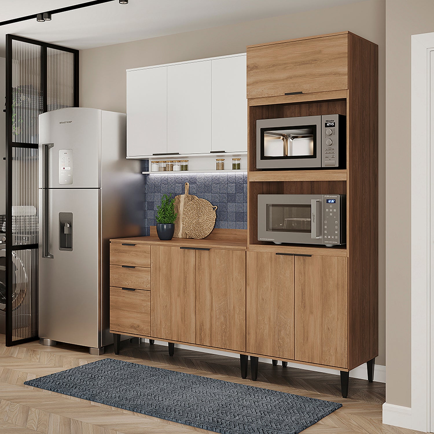 Cocina Integral Alpha Blanco y Freijo 120x80cm Con Mesón y Alacena Freijo Modular