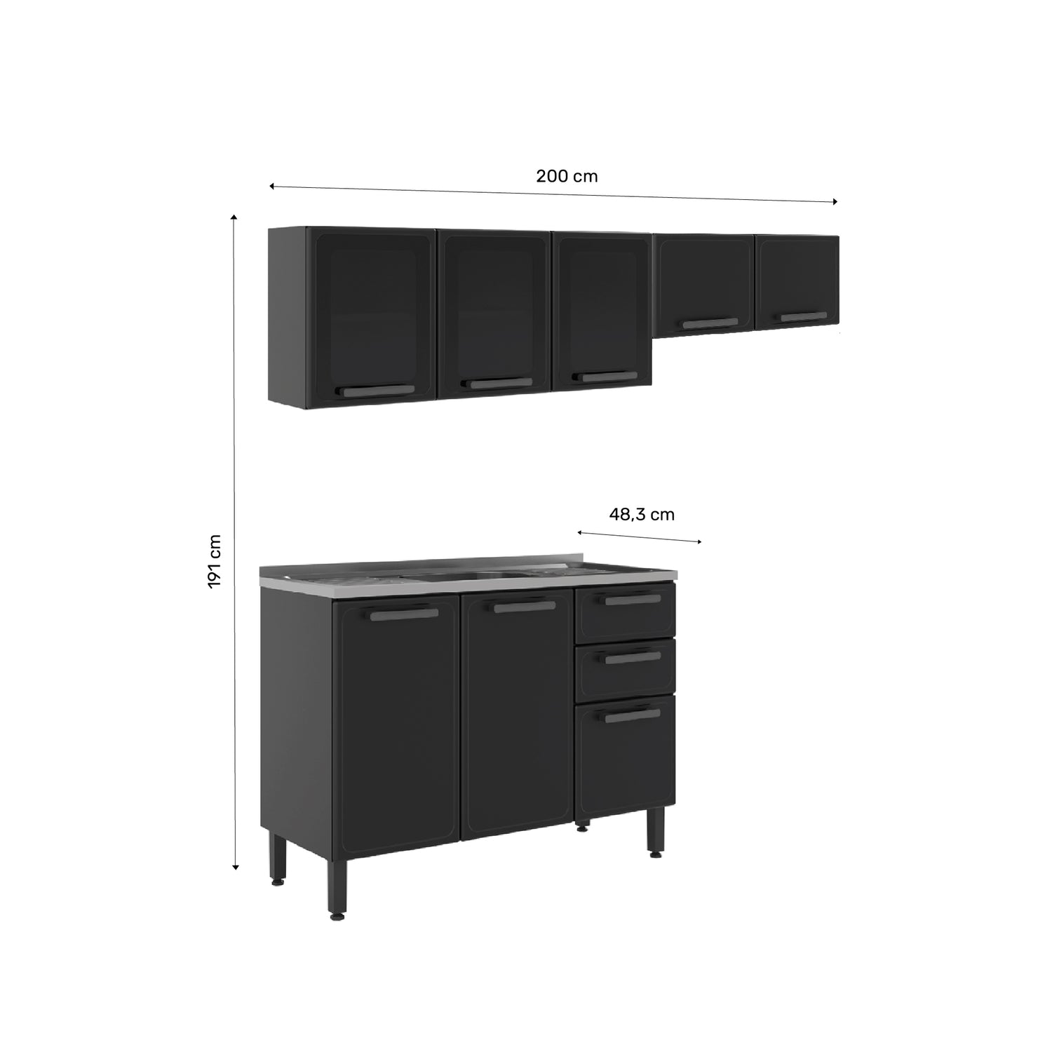 Cocina Integral Gris 200x89cm Con Mesón Con Pozuelo Centro y Puerta de Vidrio