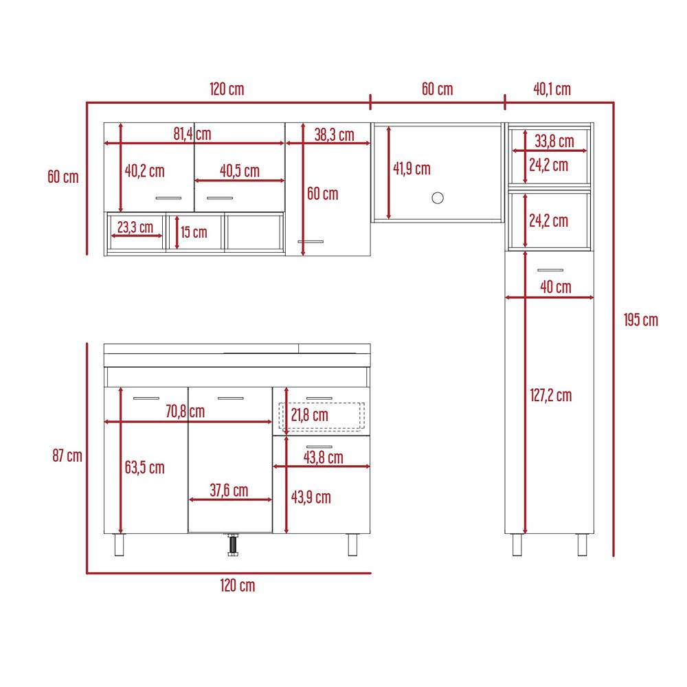 Cocina completa de 220 Mueble superor con manijas metalicas, trs puertas abatibles, amplios espacios para guardar alimentos utensilios de cocina u otros, modulo de campana y microondas, modulo inferior con manijas metalicas, tres puertas abatibles, amplios espacios para guardar alimentos utensilios de cocina u otros, cajon organizador con rieles extension total, alacena con manijas y patas metalicas amplios espacios