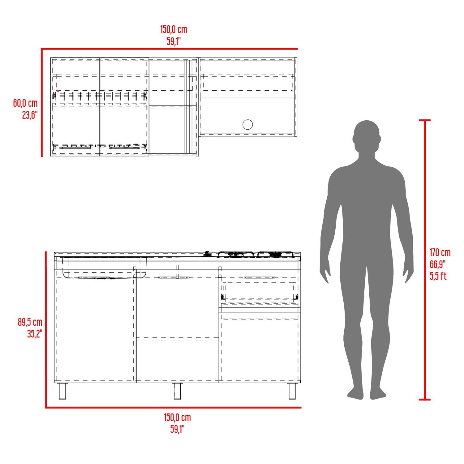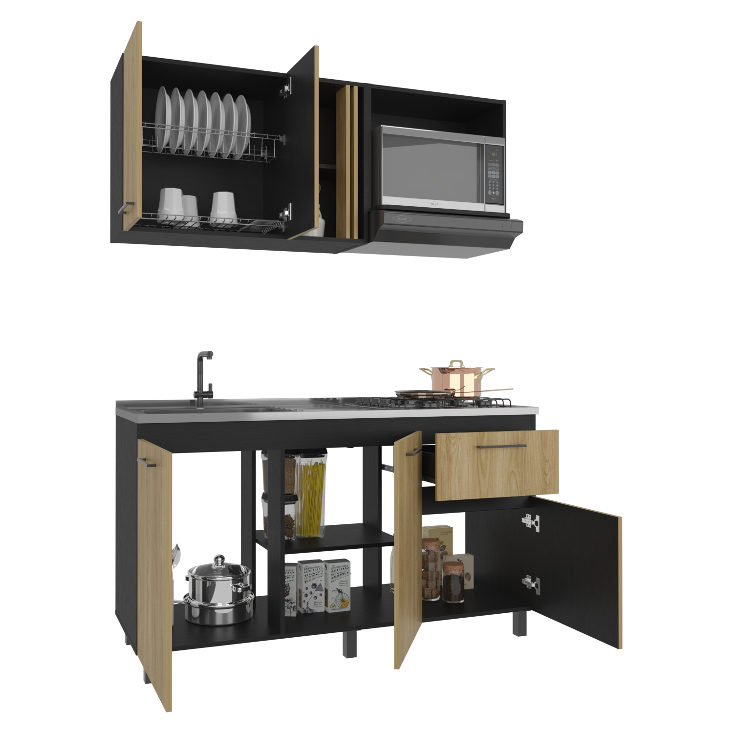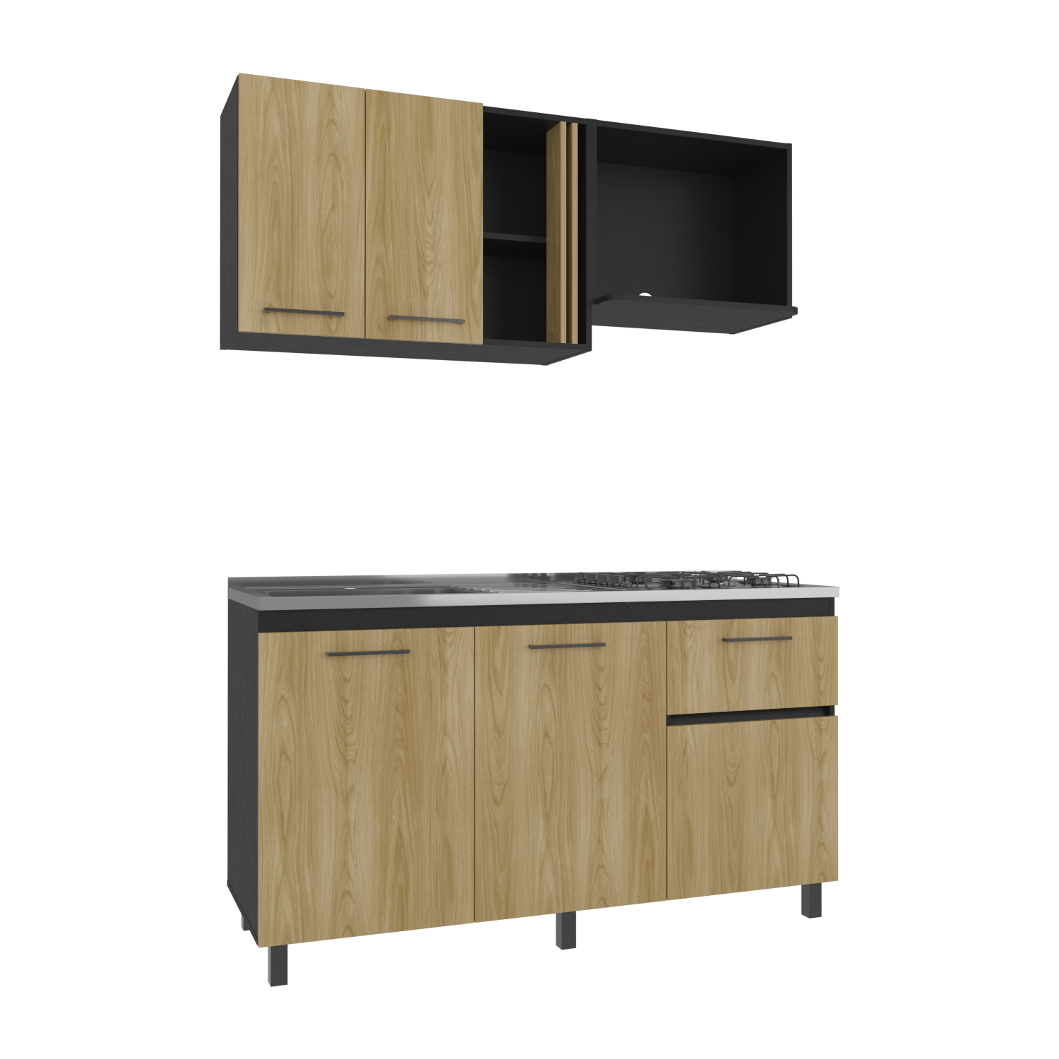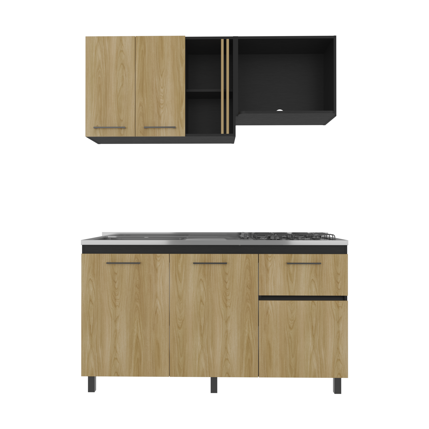 Cocina Preston Wengue y Fresno Europeo 150x60cm con Meson de Acero Al Carbon Izquierdo y con Estufa