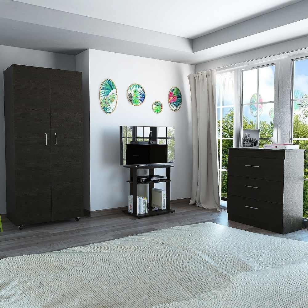 Closet iko 1,80m. Dos puertas abatibles. Tubo cromado para colgar ropa. Compartimientos para organizar. Rodachinas con y sin freno. Incluye cerradura y pasador. Cómoda Torino. Espacio superior para colocar equipos de audio y/o video. Manijas metálicas. Tres cajones organizadores multiusos. Mesa auxiliar. Espacio superior para televisores u otros objetos decorativos. Compartimiento central para DVD. Fácil instalación.