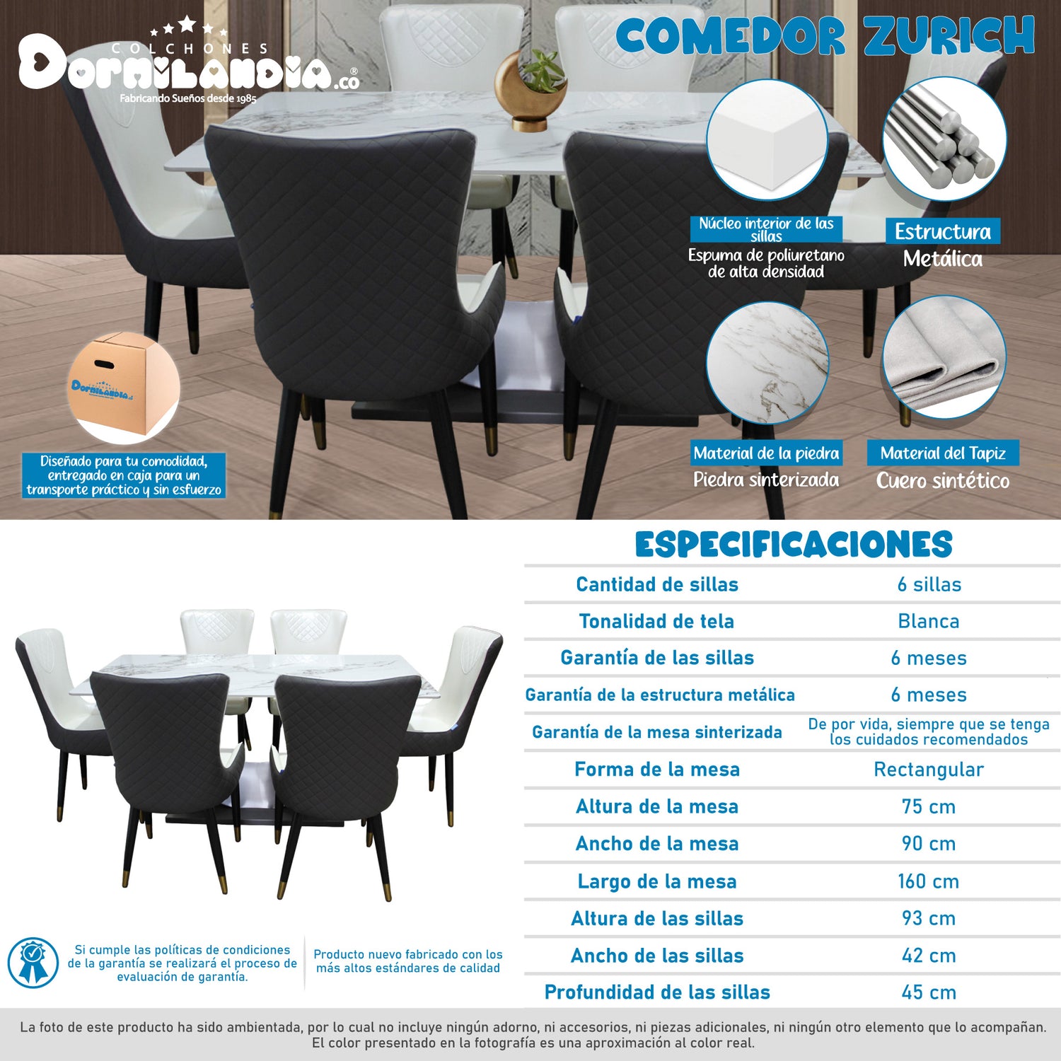 Comedor Zurich Blanco 90x75cm Rectangular de Seis Puestos con Seis Sillas