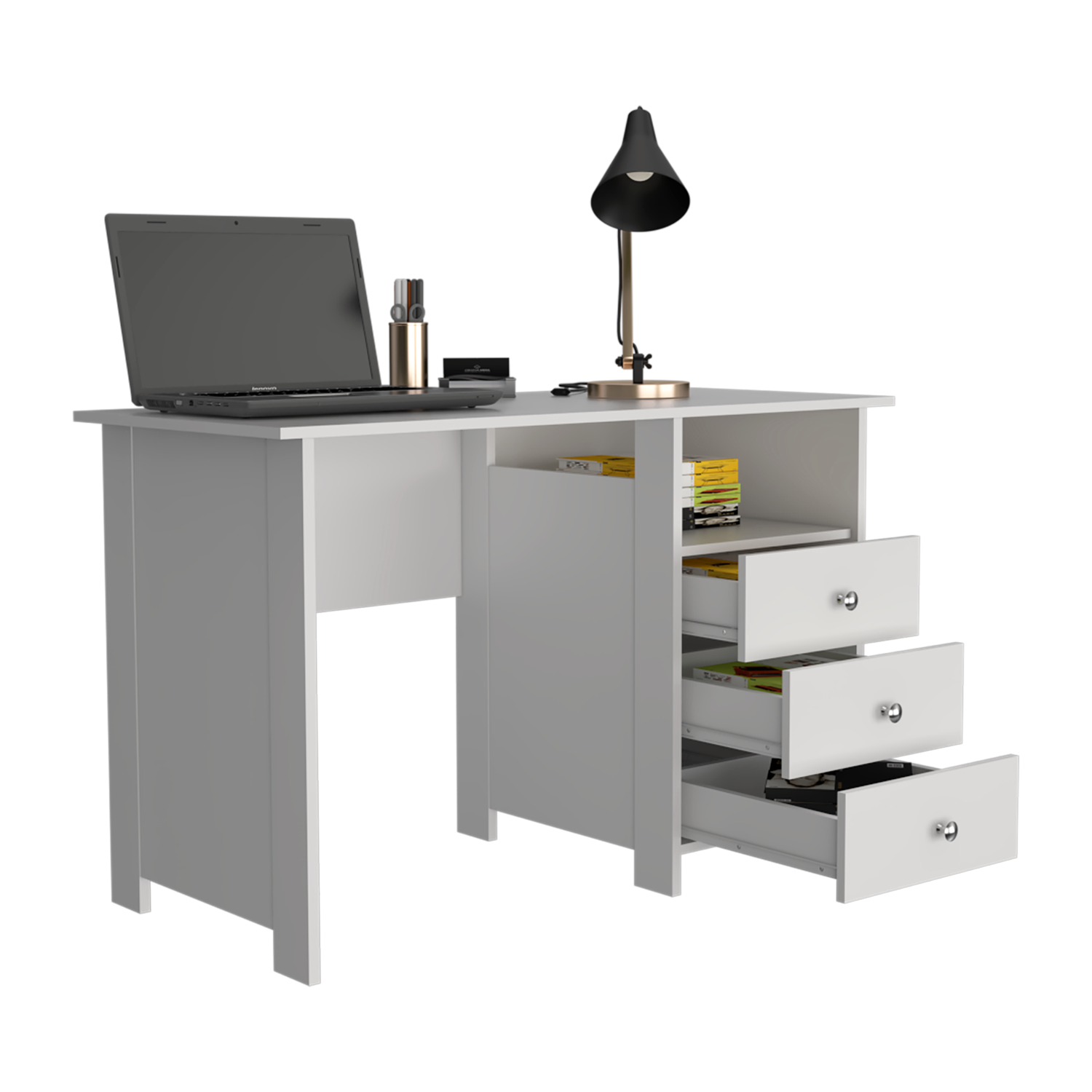 Escritorio Bianco Blanco 120x75cm con Tres Cajones y con Organizador de Libros