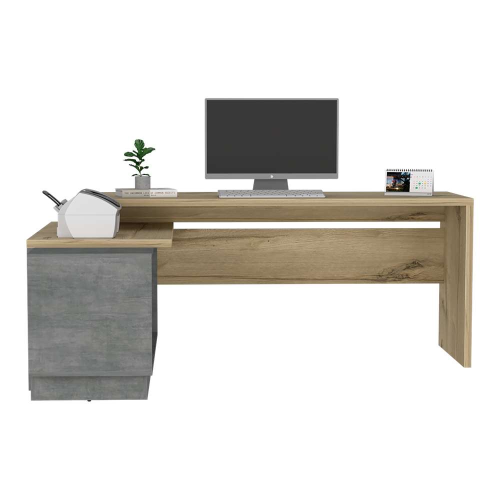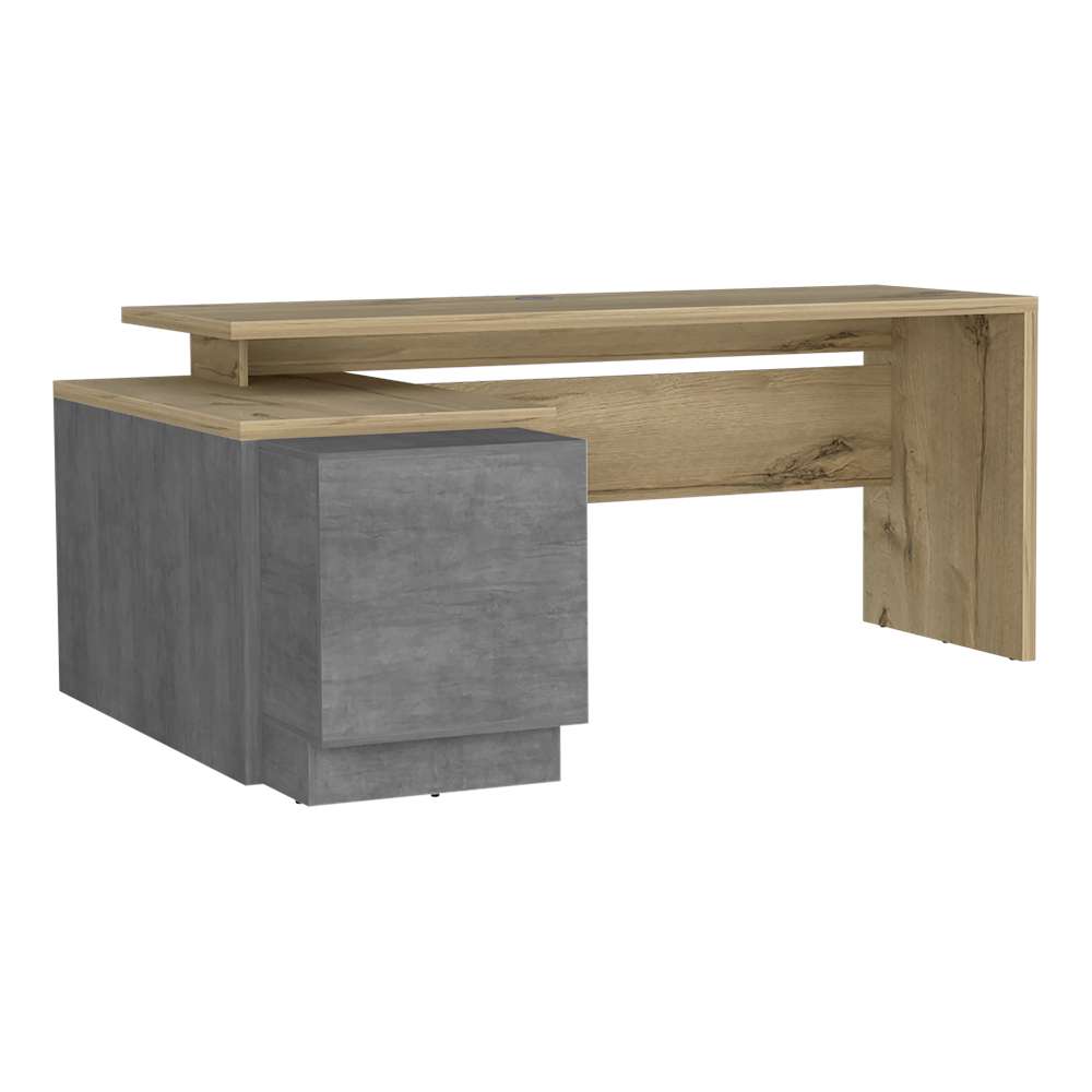 Escritorio en L con entrepaño interno, amplia superficie de trabajo, combinacion de colores, una puerte batiente