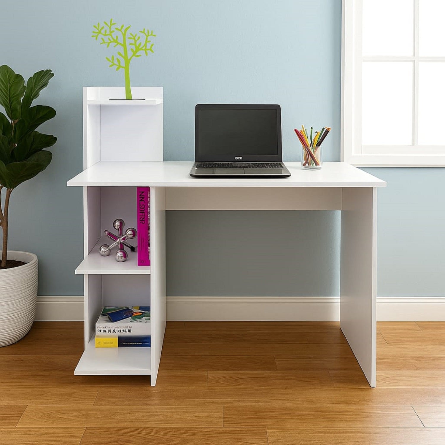 Escritorio King Blanco 110x110cm sin Cajones y con Organizador de Libros