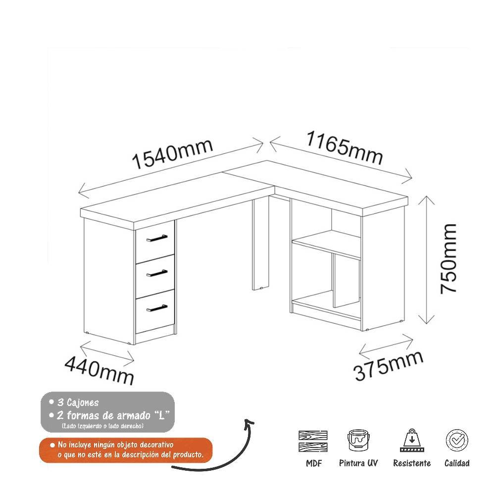 Escritorio en L Mali Bertolini •Producto Desarmado en su empaque Original, Incluye Manual de Armado Y Tornillería Necesaria. Material de la estructura: MDP - MDF y Tapa Tamburato. •Pintura texturizada de alta calidad. •Cuenta Con 3 Cajones. •4 Compartimientos para guardar. •En Forma de L •Medidas cm: Mueble: Alto: 75 Ancho: 154x116 Profundidad: 44 y 37 (Ver imagen de medidas) Optimiza sus espacios de la mejor manera posible dando un toque elegante y sofisticado con el Escritorio Mail, en forma de L, cuenta con Tapa de tamburato, mucho más resistente, 3 cajones y Se puede armar para el lado izquierdo o derecho. El tono de la imagen puede tener alguna variación leve. GARANTÍA: 3 meses. CONDICIÓN: Es indispensable que se garantice la integridad del producto; se recomienda que al momento de recibir su paquete revise que las piezas estén en perfecto estado. Solo se podrá iniciar el trámite de cambio o retracto, cuando los productos no presentan rastros de haber sido armado y cuenten con las etiquetas intactas, la caja y los accesorios se encuentran en perfecto estado, para el trámite de retracto o reclamaciones por avería tendrá vigencia durante los primero 5 días hábiles después de haber recibido el paquete. DESPACHO: una vez recibido su pedido, será despachado al siguiente día hábil.