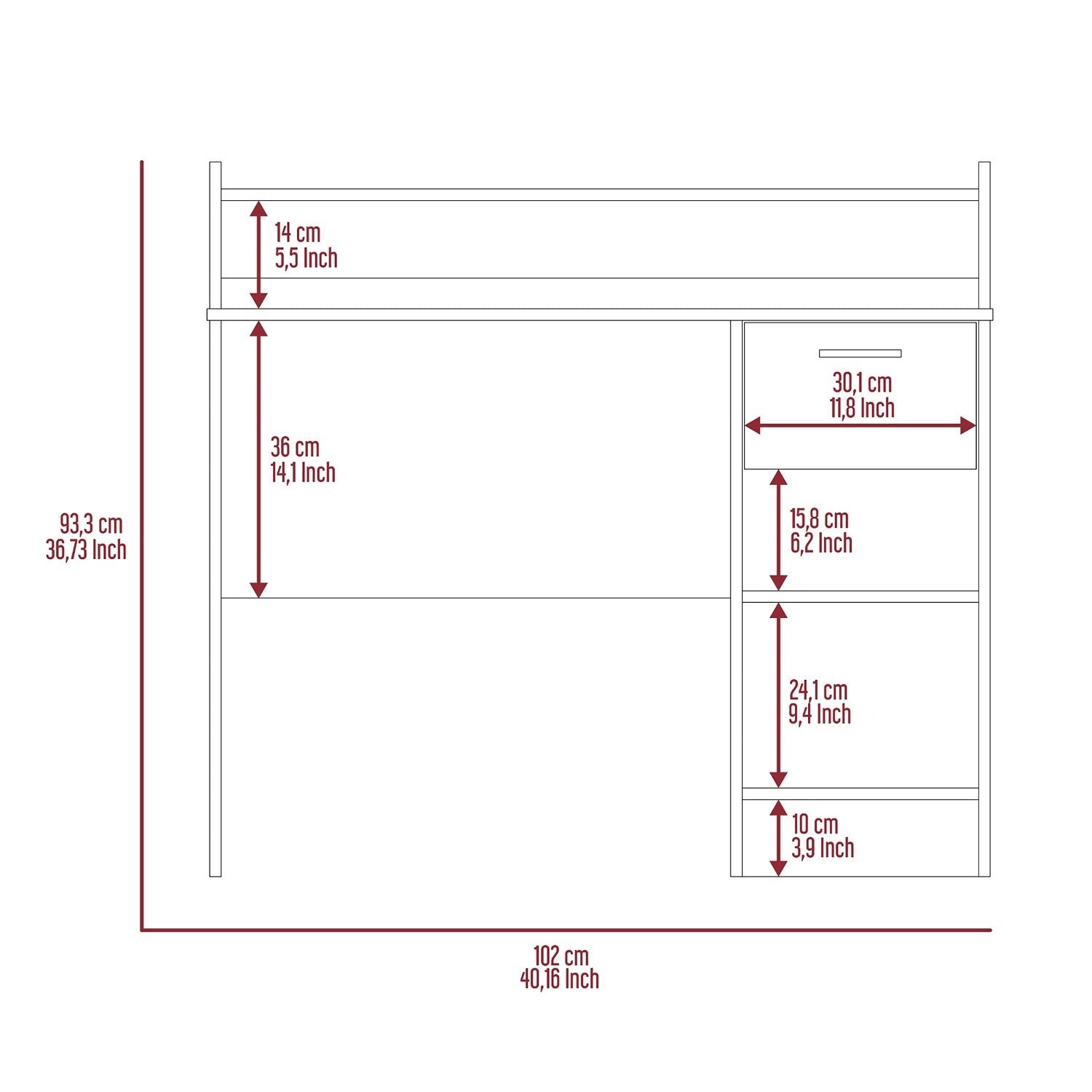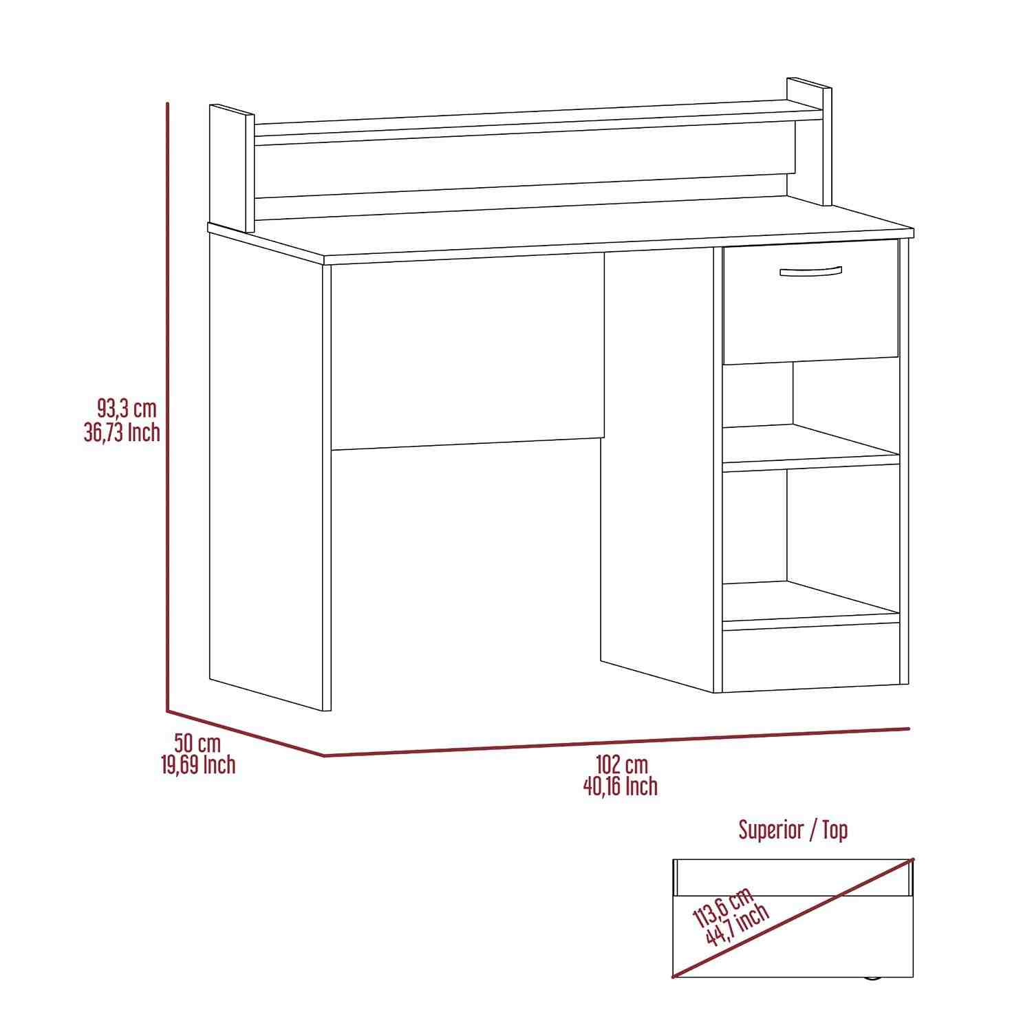 Escritorio con amplia superficie de trabajo, entrepaños para ubicar libros y/o elementos decorativos, un cajon, manija metalica