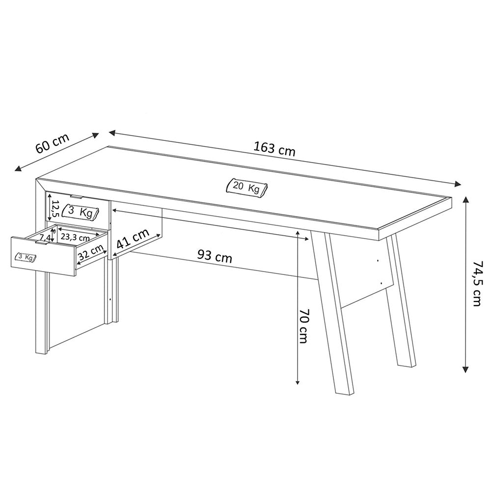 El Escritorio Palermo se caracteriza por su innovadora propuesta de diseño, la cual es compatible con diferentes tipos de decoración. Es un mueble ideal para el hogar o la oficina, por contar con dos cajones en donde podrá almacenar utensilios de uso diario, y dos patas en MDF de 25mm que dan un toque sofisticado al espacio. Ha sido producido con aglomerado de madera y su acabado en melamina garantiza mayor resistencia y durabilidad. Con sus productos, Muebles 2020 quiere generar ideas para darle una nueva vida a los hogares. Cada mueble es una mezcla de creatividad, diseño, funcionalidad y mucha dedicación. Largo: 163 cm Alto: 74,5 cm Prof: 60 cm Peso neto: 30,9 Kg Estructura MDP 15mm Incluye: - Dos (2) cajones - Dos (2) manijas - Kit de herrajes - Manual de armado No incluye: - Accesorios - Producto ambientado, no incluye accesorios. - El color de la imagen es de referencia y puede tener variaciones en el producto real. - Se recomienda que el producto sea armado por un experto, o en su defecto que se usen las herramientas adecuadas, según lo establecido en el manual de armado. - Si el cliente decide armar él mismo el mueble, en caso de daño por una instalación indebida, o no tomando en cuenta las instrucciones señaladas en el documento de instrucciones de armado, deberá cubrir el costo de reparación.