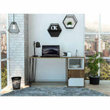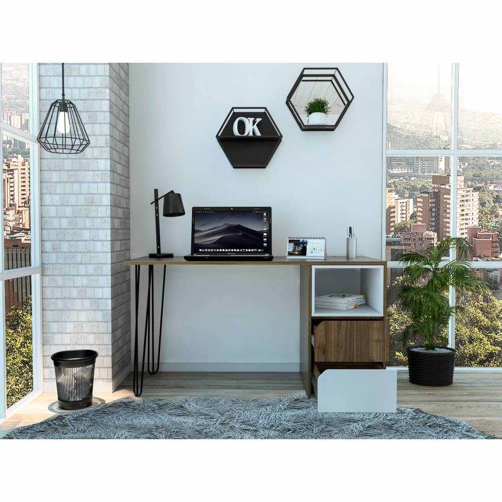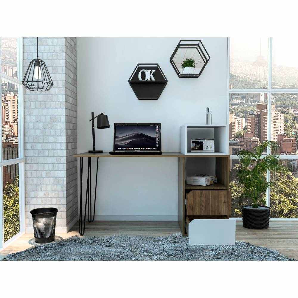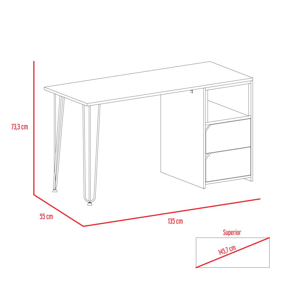 Tiene amplia superficie de trabajo. Cuenta con dos cajones, repisa móvil y un bellísima combinación de colores. Este escritorio tiene patas metálicas negras.